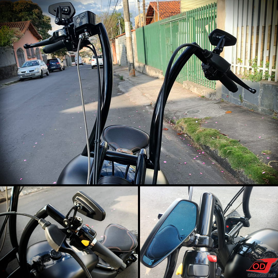 Outra solicitação chave foi a produção de guidão seca suvaco, na altura certa para o cliente para deixar os braços em 90º e os cotovelos levemente dobrados, permitindo uma posição de pilotagem com as costas mais retas, uma vez que o guidão original da moto tende a jogar o piloto um pouco para frente. O formato escolhido foi o Roland Sands e o guidão foi produzido todo em inox (não enferruja), com tubo 1 1/4″ e redução para 1″ nas pontas e no riser, deixando-o com visual bem robusto. Os chicotes dos punhos de partida e luz foram alongados e passados por dentro do guidão.