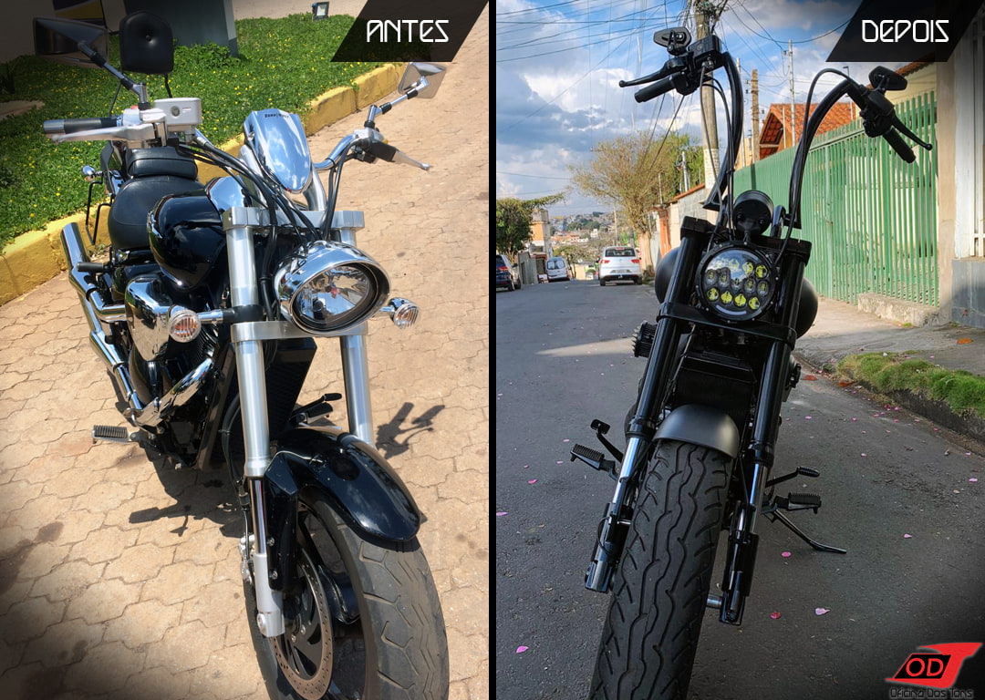 A moto ganhou o seu visual próprio em cada detalhe, de acordo com a personalidade e as preferências do cliente: optamos por novo modelo de farol de led; substituímos o painel original e sua carenagem por velocímetro redondo; os retrovisores custom foram instalados nos manicotos, os paralamas curtos receberam suportes diferenciados; o banco selim dessa vez ganhou um suporte fixo estilizado ao invés das tradicionais molas; o tanque passou por trabalho de lanternagem para retirada da tampa com luzes indicadoras; instalamos setas dianteiras bullet e filtro de ar esportivo com tampa estilo grelha; além de novos desenhos e texturas para a capotaria do banco. Outras exclusividades foram a instalação de um soco inglês na tampa da válvula de ar secundário e de um porta celular/documentos na peça abaixo do banco.
