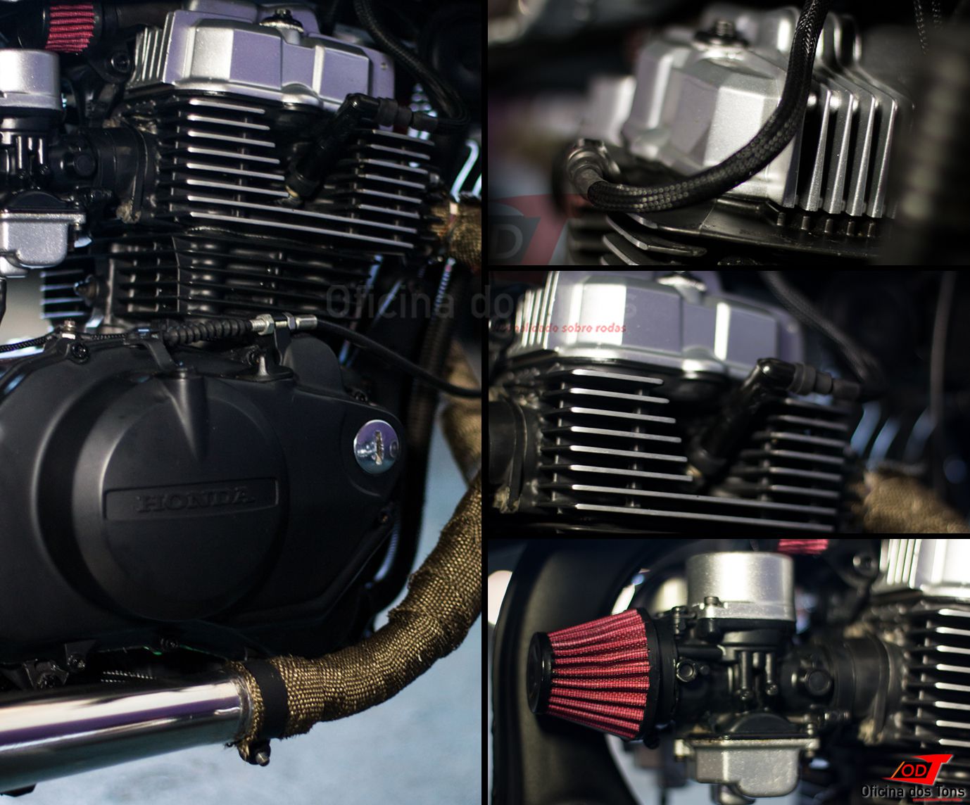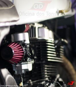 O motor retificado e pintado foi montado novamente na moto. Os carburadores também receberam pintura nova além de filtros esportivos.