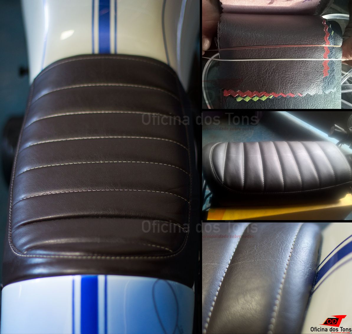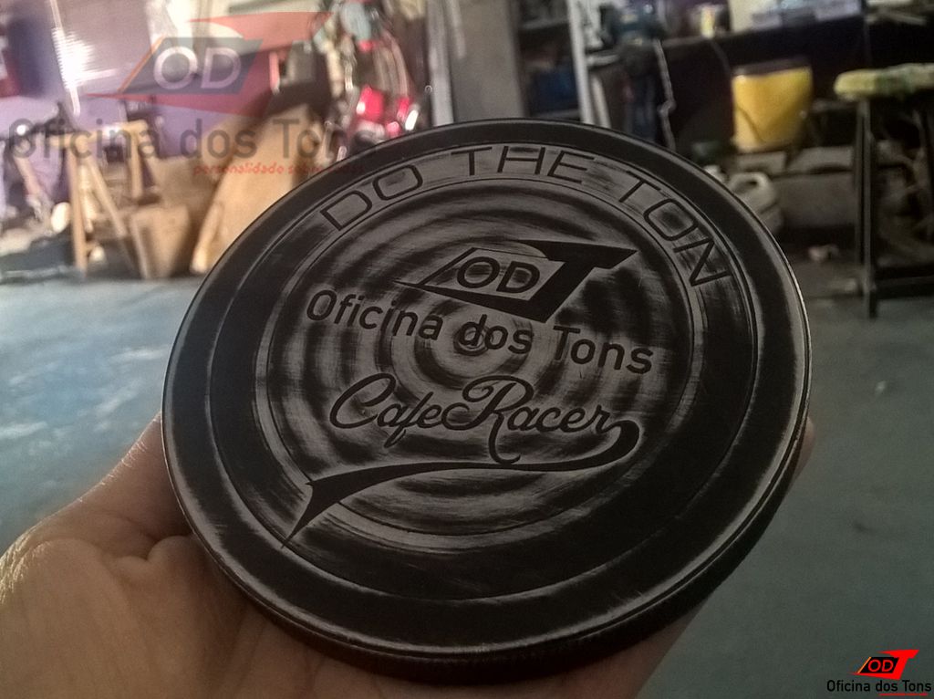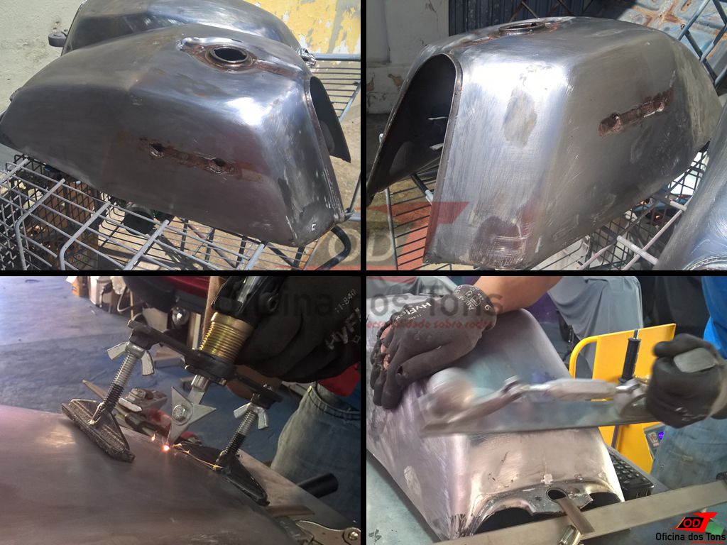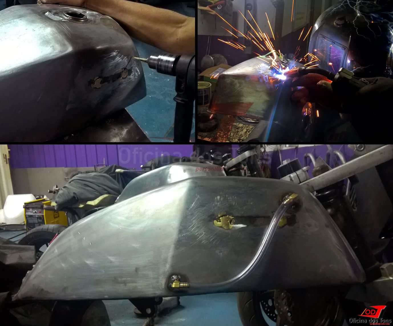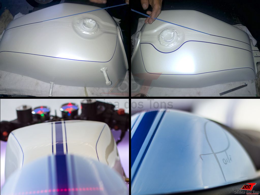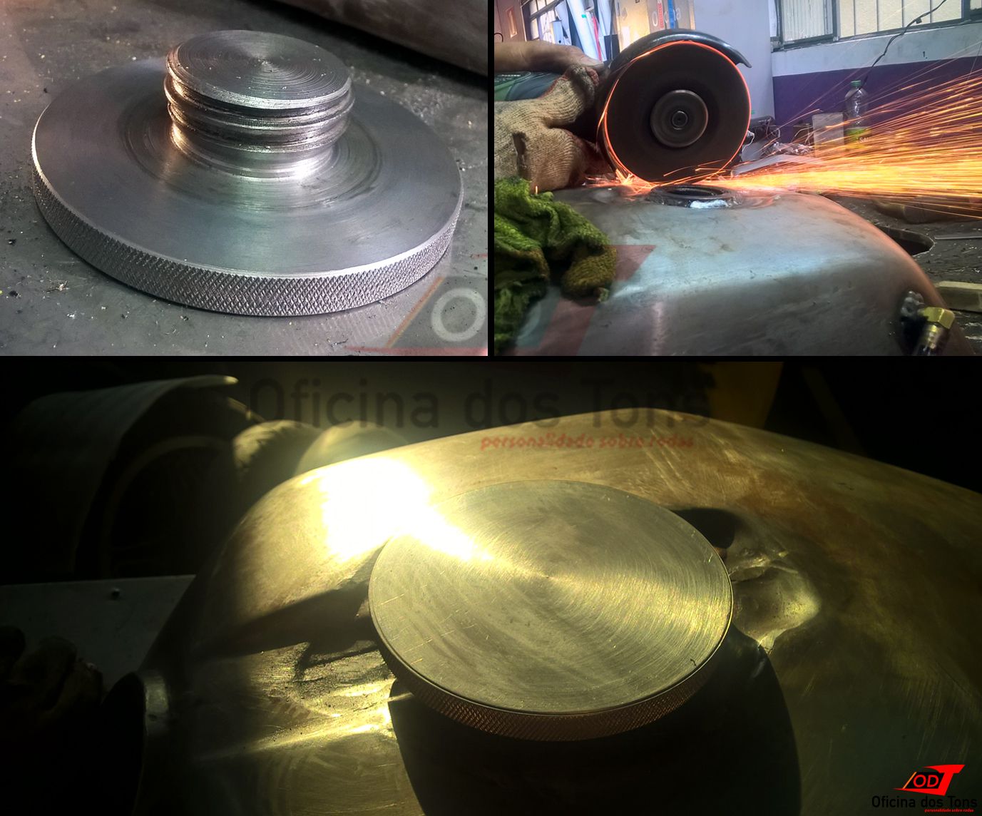 O tanque foi uma das peças que mais sofreu alterações. Além do recorte na parte inferior que já citamos e da lanternagem de amassados, foram adaptadas também mangueira de nível de combustível e tampa de rosca torneada.