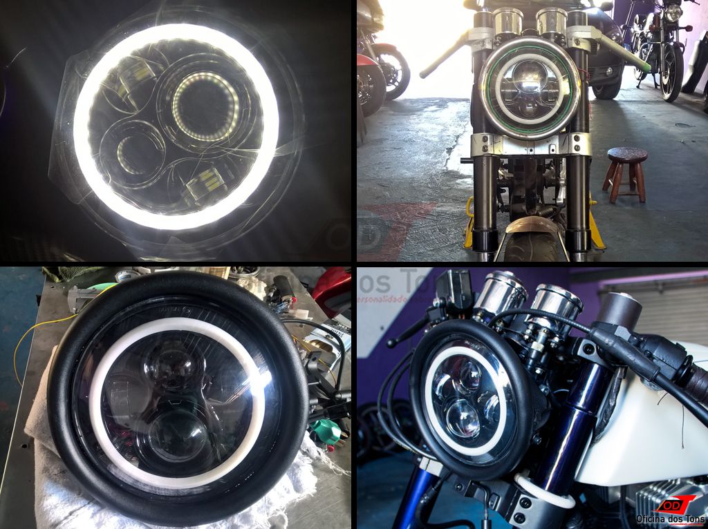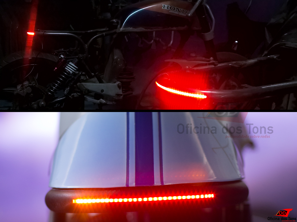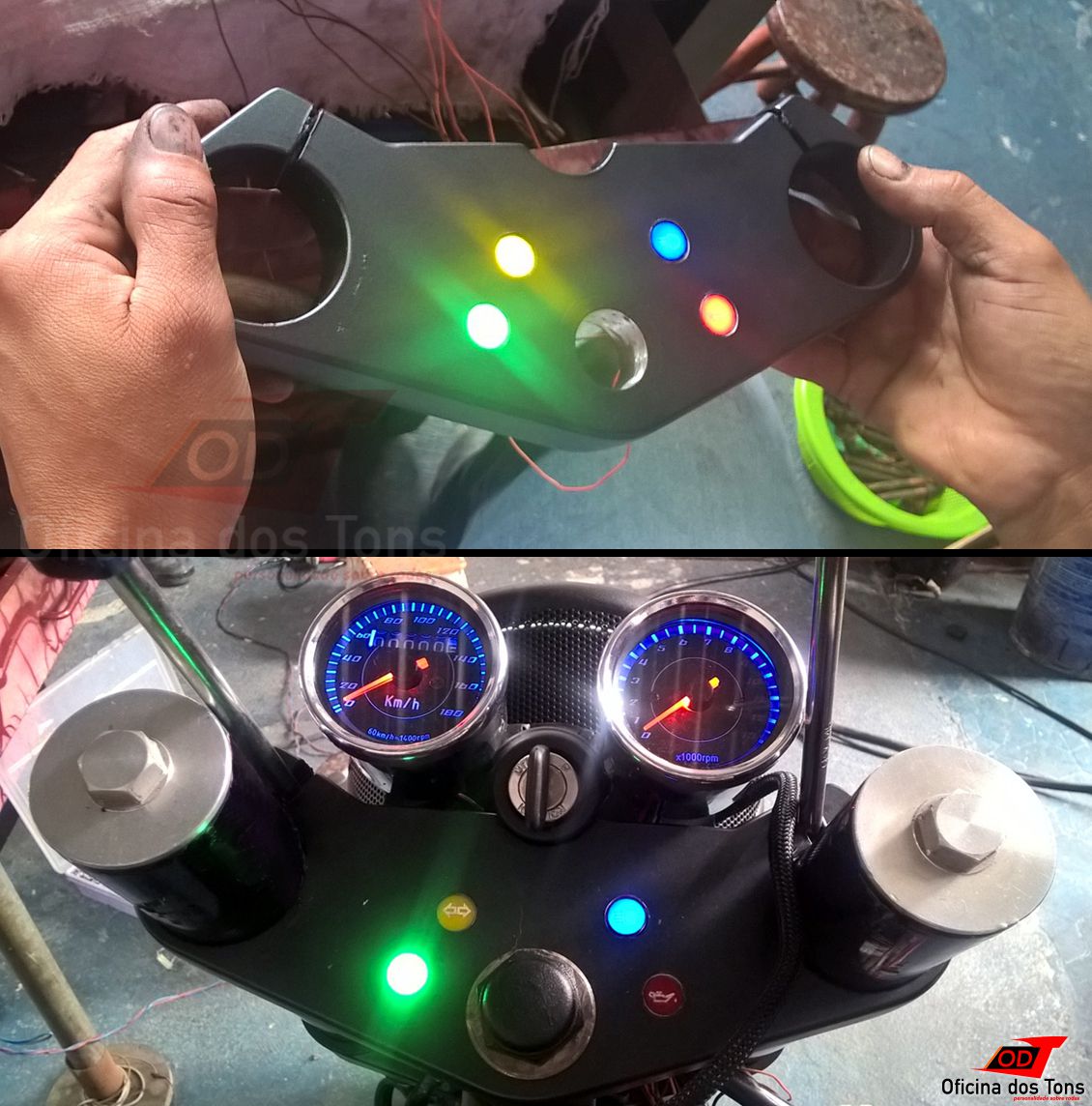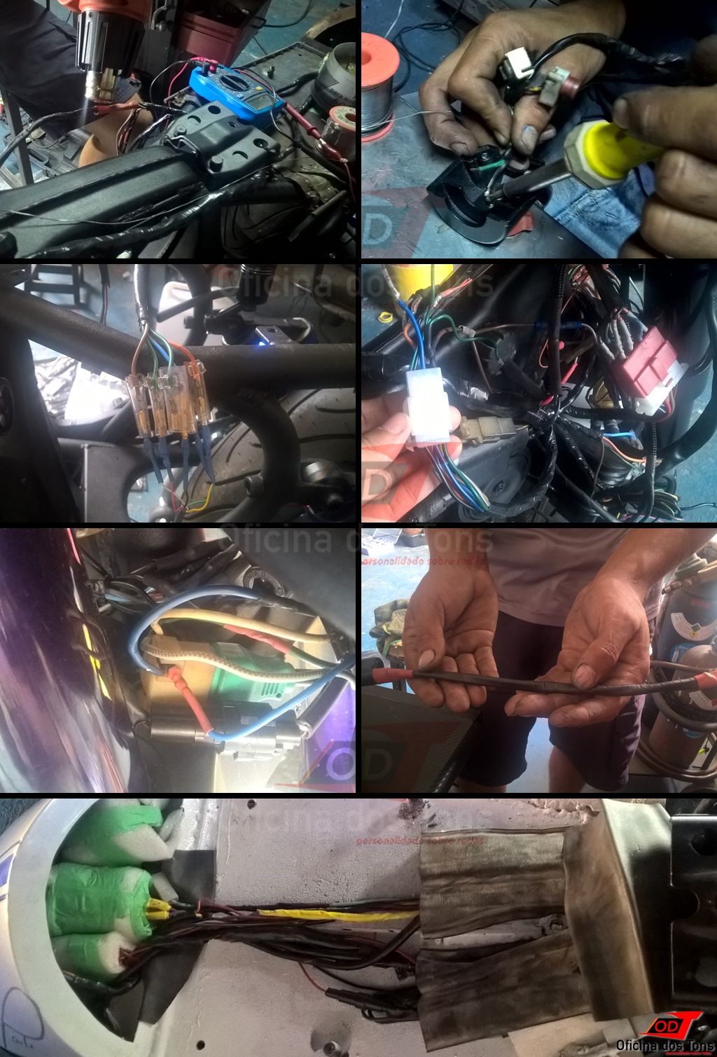 A parte elétrica precisou ser totalmente refeita, pois o chicote da moto não se encontrava em bom estado. Além disso, foram feitas adaptações para receber os circuitos com led. Tudo cuidadosamente soldado, revisado e finalizado com fita isolante sem cola, termo retrátil e malha náutica.