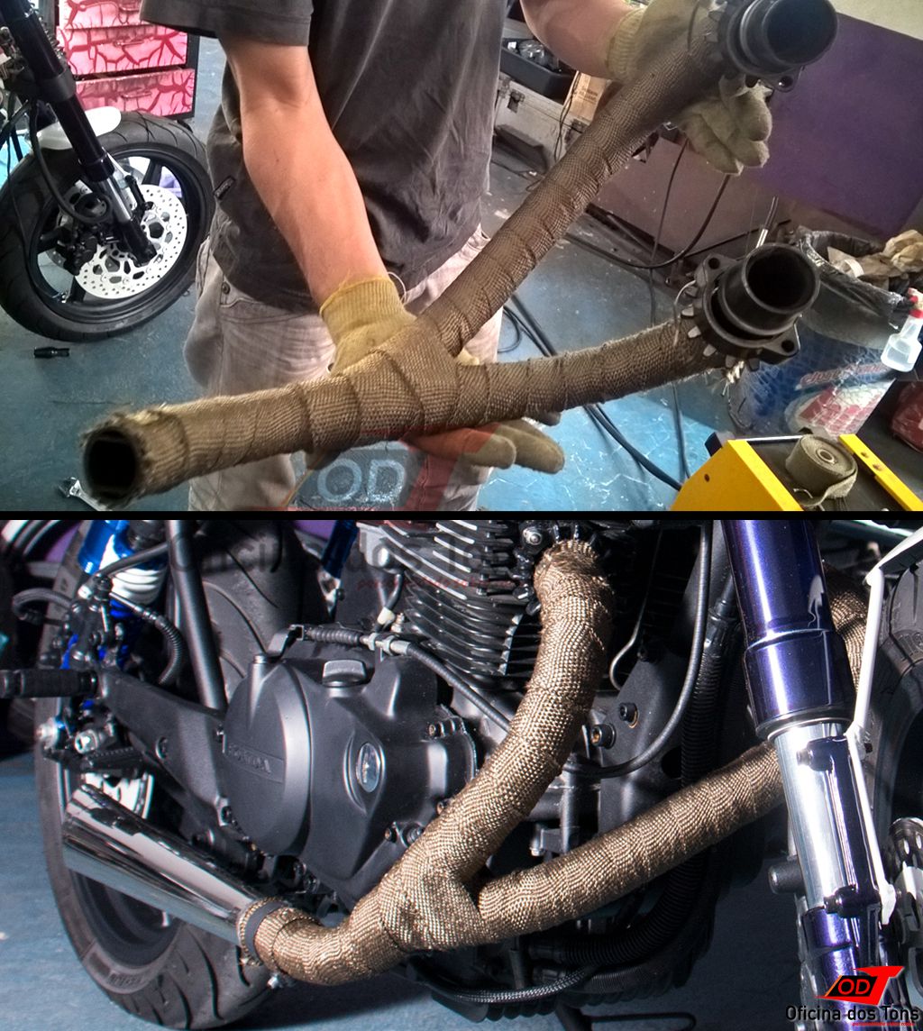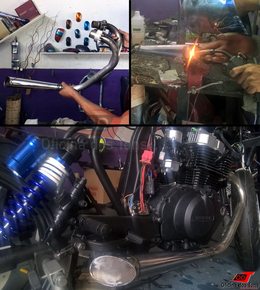 Com o motor de volta na moto foi possível realizar as modificações no escapamento original da moto. As duas saídas, que antes ficavam uma para cada lado, foram unidas para o lado direito e a ponteira recebeu um corte enviezado, abafador e acabamento em chapa perfurada.