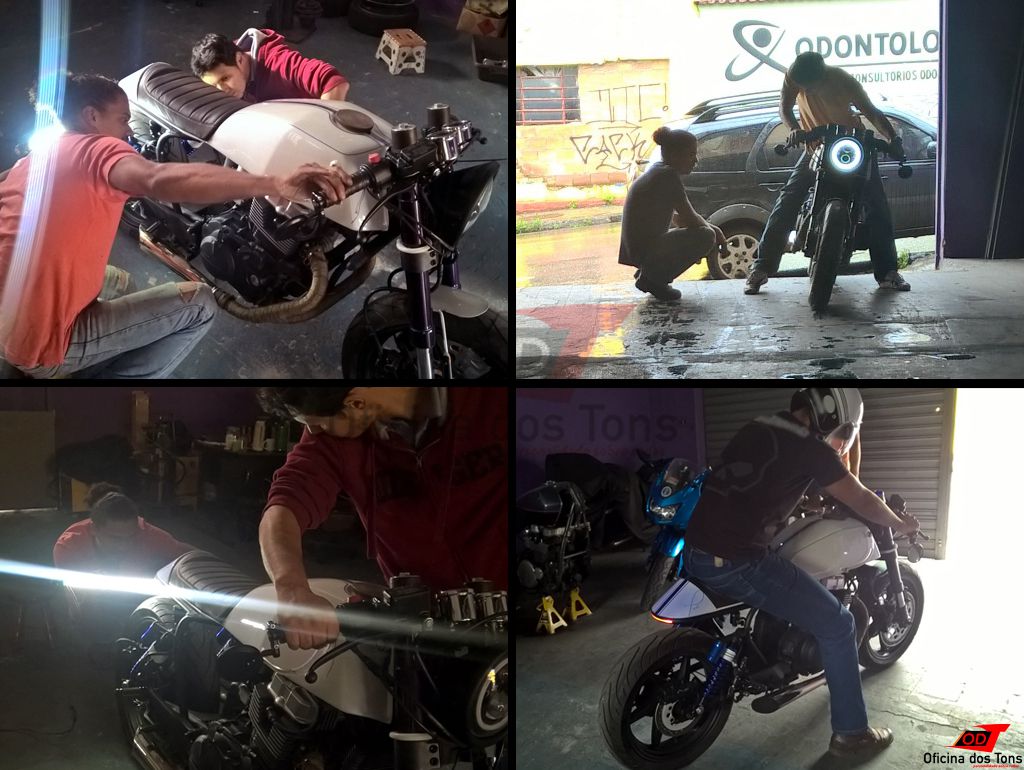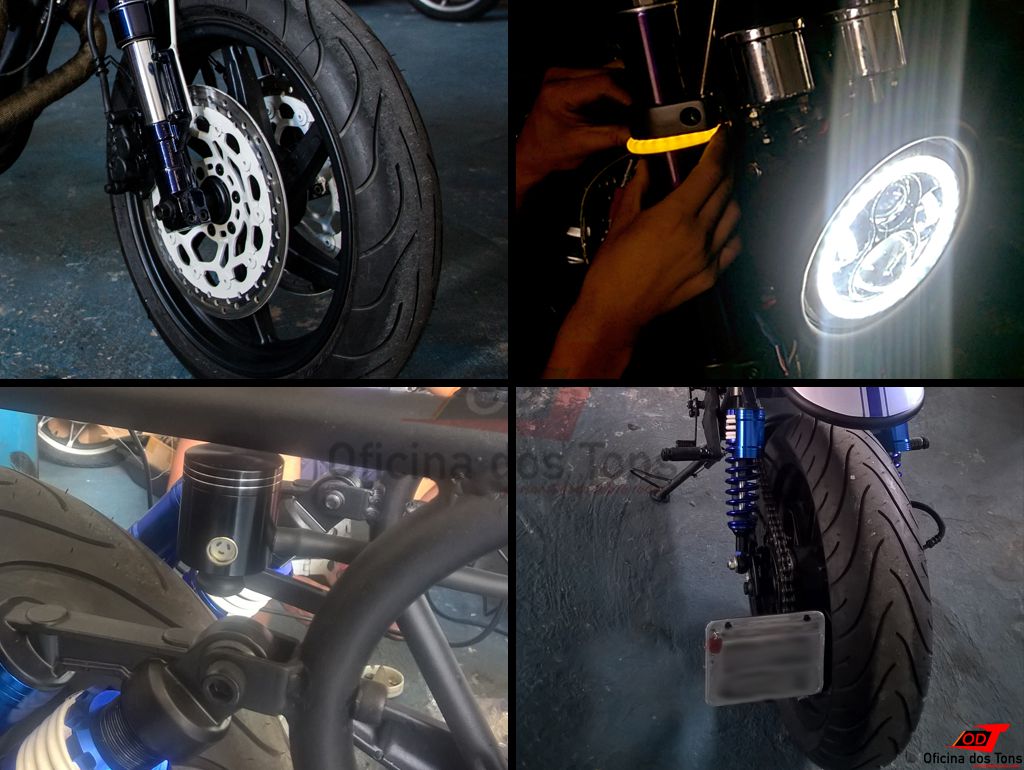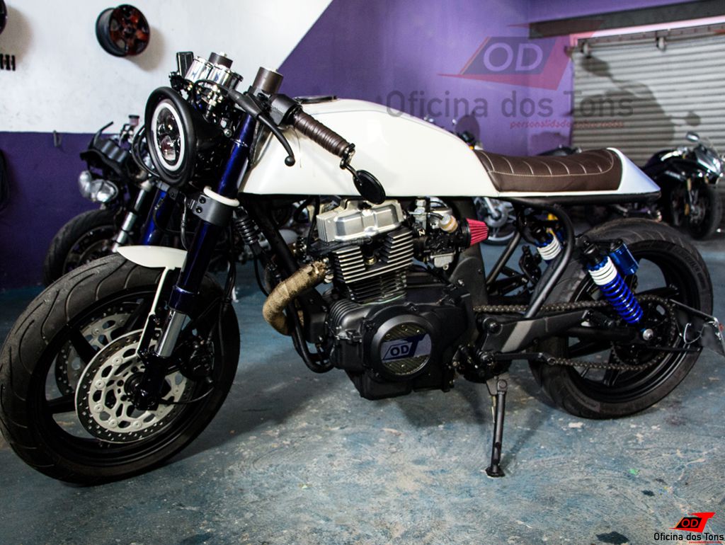 Detalhes: Esse foi um projeto totalmente criado e realizado aqui na Oficina, buscando agregar todas as características de uma legítima Cafe Racer. Além do visual curto e reto, com banco para 1 pessoa e a clássica rabetinha, fizemos um estudo de todas as modificações que poderiam agregar mais esportividade e agilidade à moto, dentro do orçamento acordado com o cliente. Dessa forma, o trabalho englobou modificações no chassi; adaptação de frente e rodas esportivas; novo sistema de frenagem dianteiro e traseiro; adaptação de novos amortecedores; produção de relação sob medida; modificações no tanque e no escapamento; retífica do motor que apresentou alguns desgastes; revisão mecânica completa; instalação de filtros esportivos; produção de banco, rabeta e paralama dianteiro novos; fiação elétrica nova; sistema de iluminação e sinalização em led; pintura completa da moto; além da finalização com alguns detalhes bem personalizados. O projeto durou em torno de 160 dias, com muito trabalho feito à mão e a parceria de profissionais de primeira.