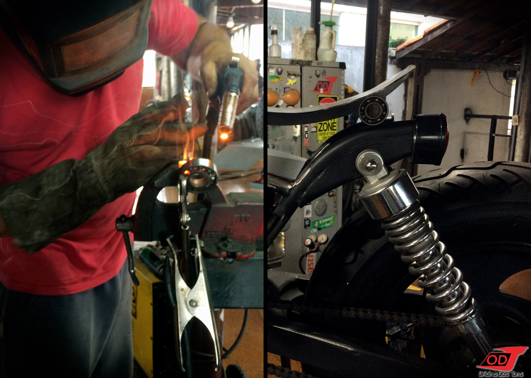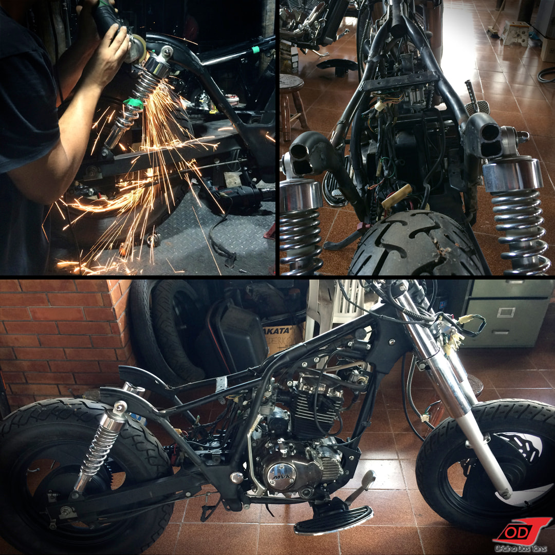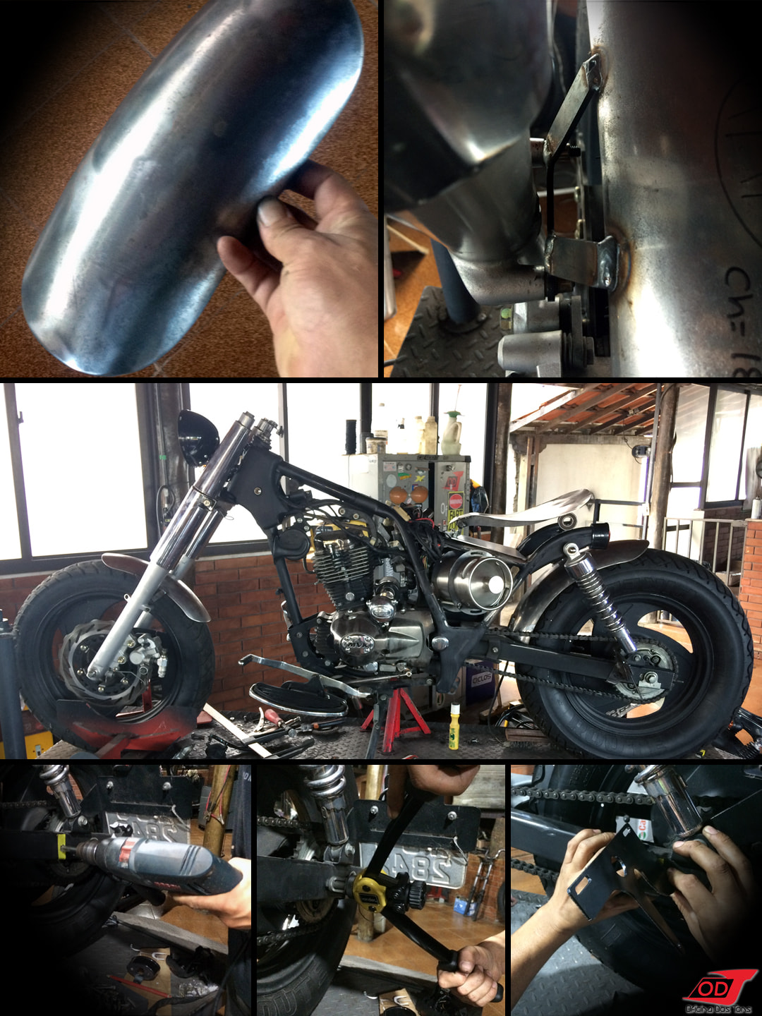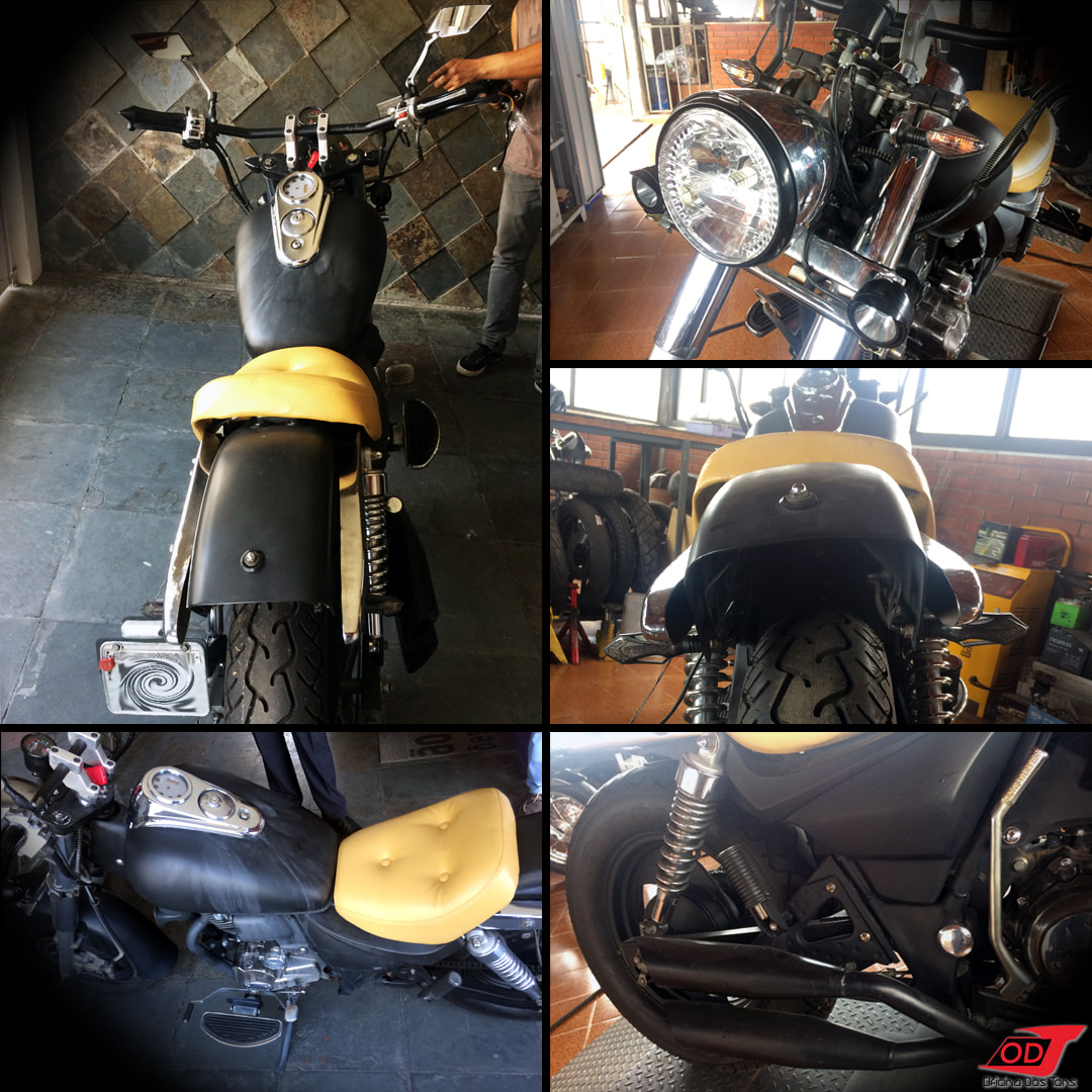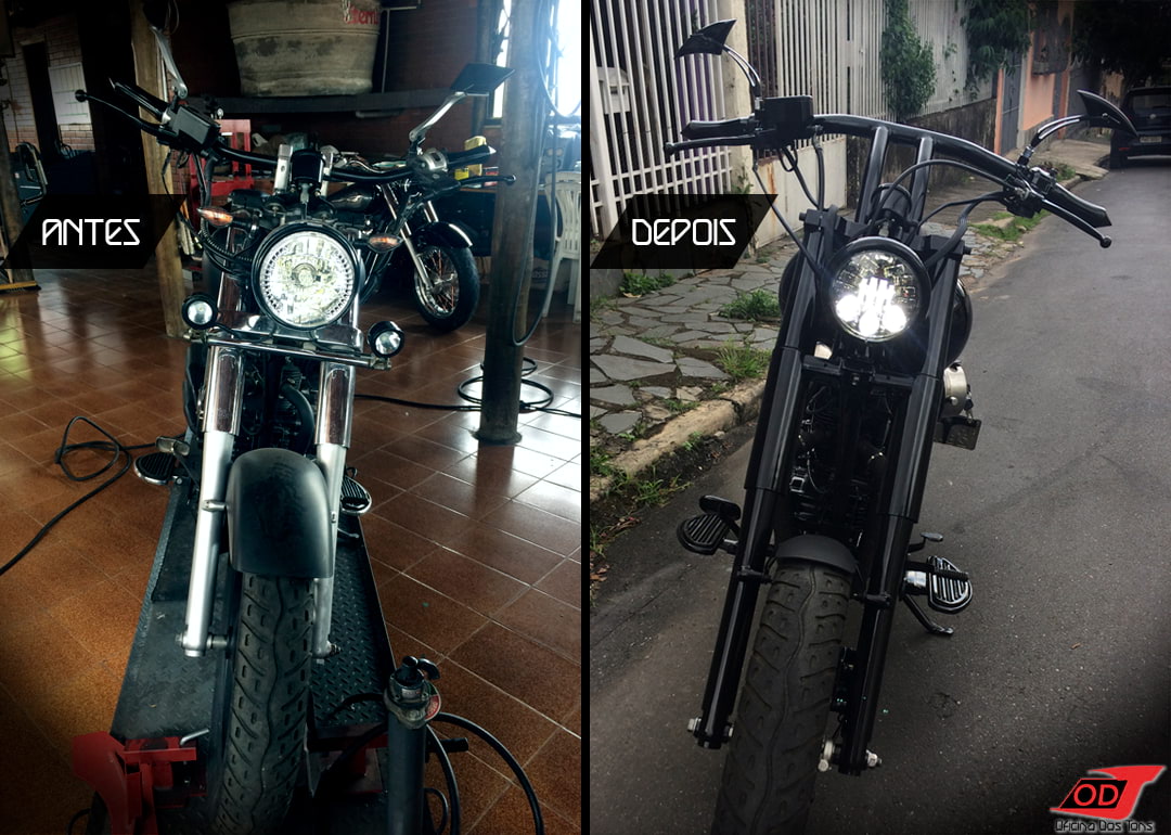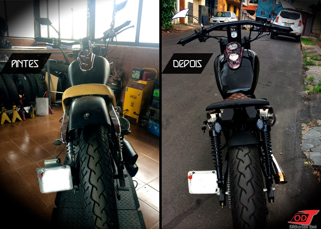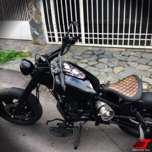 Essa moto já havia sofrido anteriormente algumas modificações feitas pelo cliente, como retirada do banco do garupa, encurtamento do paralama traseiro, detalhes de pintura em preto fosco, instalação de suporte de placa lateral e troca de algumas peças, mas o cliente solicitou à Oficina que criasse e produzisse do zero um visual completo Bobber para a sua moto.