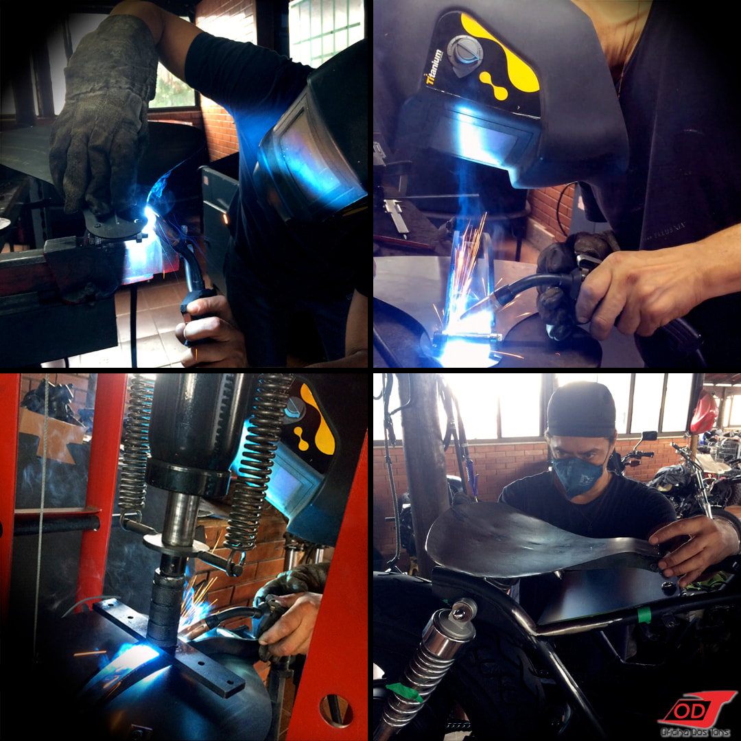 A etapa seguinte foi a produção da chapa do banco selim e seus respectivos suportes, feitos sob medida para ajustar a posição de pilotagem ao tamanho do cliente e equilibrar visualmente a parte traseira da moto.
