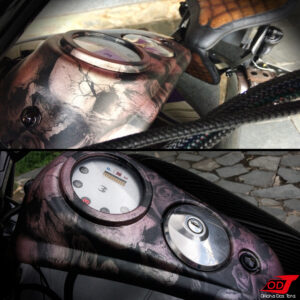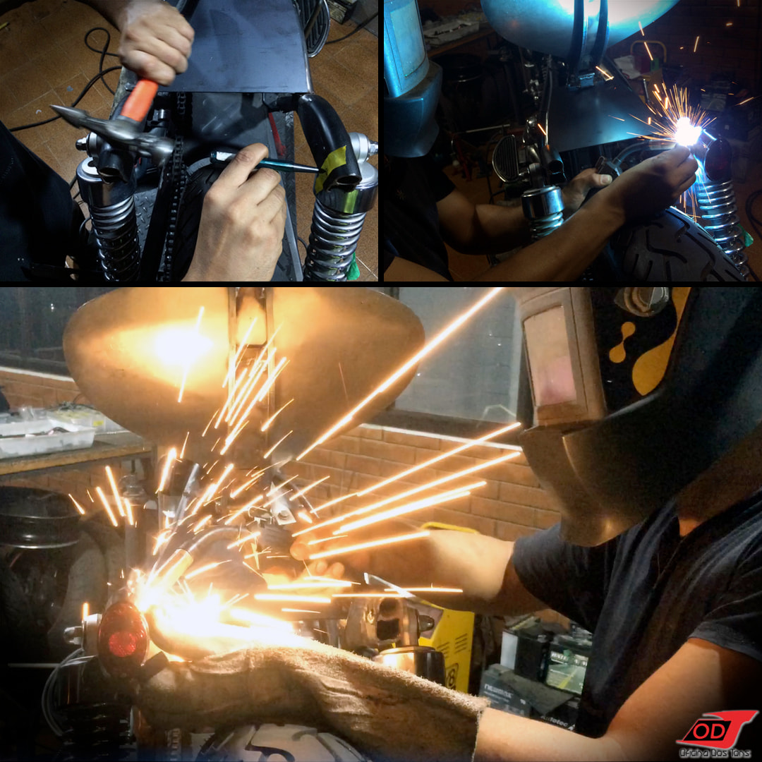 Iniciamos os trabalhos retirando todas as peças que iriam ‘sair de cena’, projetando a partir de moldes as peças novas e desenhando no computador as chapas que seriam cortadas em CNC. Com as chapas prontas, partimos para as modificações diretas na moto, como a redução da parte traseira do chassi.