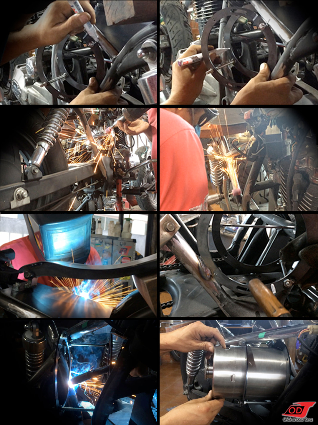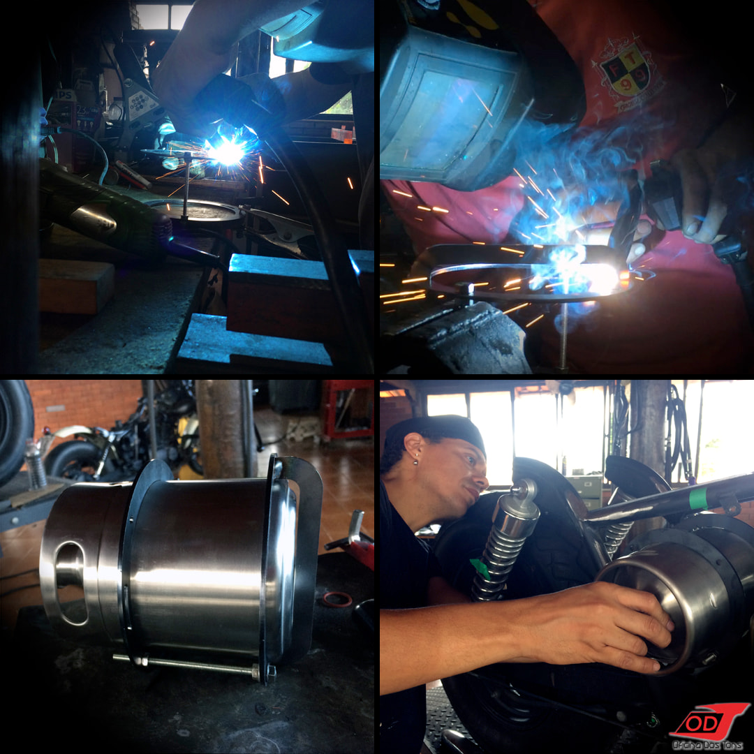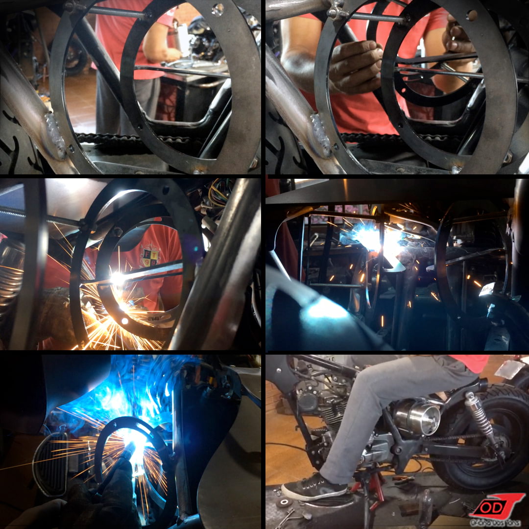 Criamos suportes com dois aros de sustentação e um limitador ao final para encaixe exato dos barris. Daí foi encontrar a posição certa no chassi para alinhá-los com simetria, pensando também nas pernas do piloto, de acordo com a altura do nosso cliente. E ‘solda pra que te quero!’