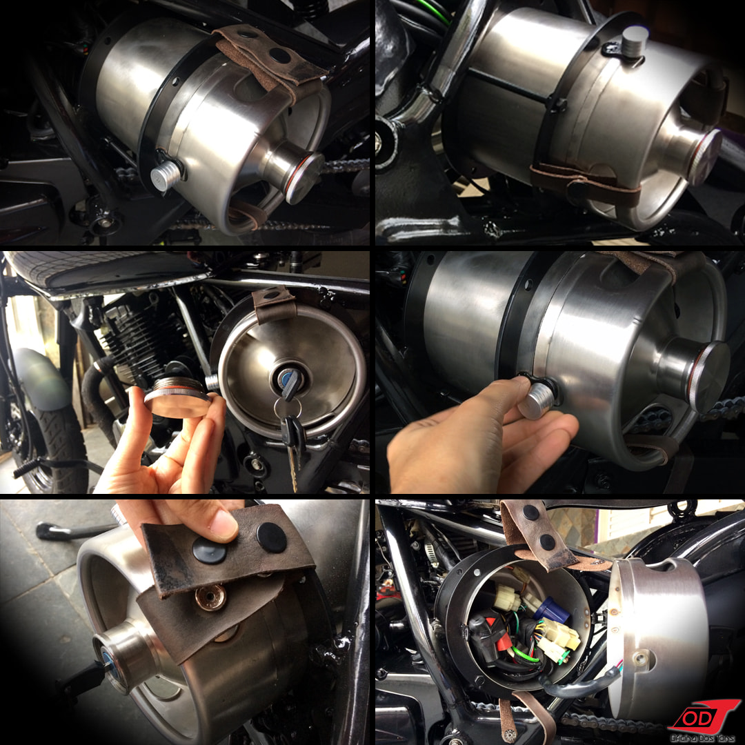 Para garantir a fixação dos barris e facilitar a sua retirada, fizemos correias de couro com botões de pressão. No barril esquerdo, para acomodar o chicote elétrico, fizemos um corte reto na parte superior, com adaptação de dobradiça e parafuso torneado, permitindo abri-lo e fechá-lo. Vale destacar ainda a possibilidade de ‘esconder’ a ignição da moto ao deixar o barril com a sua tampa de rosca.