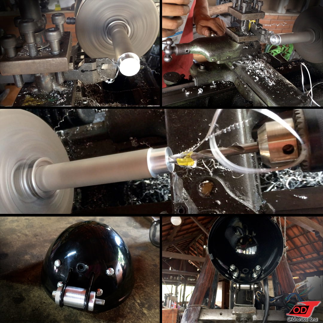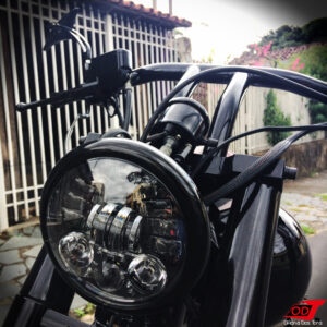 Como já pode ser visto na foto anterior, substituímos o farol da moto por modelo de led de 5.75” com carcaça redonda e produzimos seu suporte com usinagem de espaçadores. Optamos por farol com função de setas embutidas, o que, juntamente com paralama dianteiro curto, proporcionou deixar a frente da moto bem limpa.