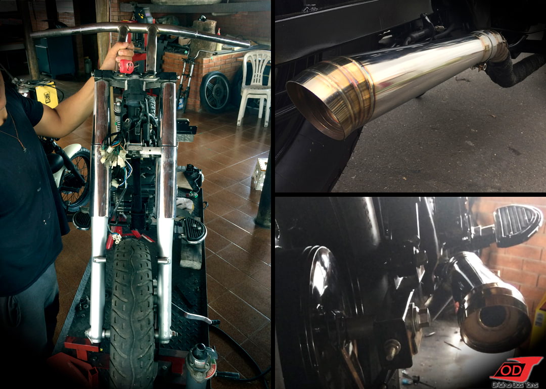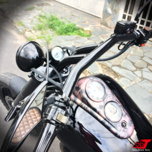 Falta citar ainda duas últimas peças-chave da moto: o guidão T-bar que compôs muito bem o visual da frente juntamente com as bengalas, trouxe estilo, presença e conforto na tocada; e a ponteira estilo megafone com cordões de solda à mostra, que encorpou o som da moto e deu o toque final no aspecto rústico do projeto.