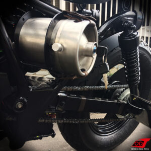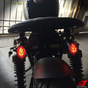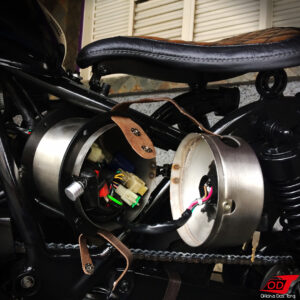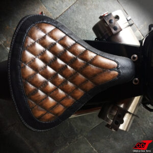 As clássicas molas que normalmente sustentam a parte traseira do banco em projetos Bobber dessa vez foram substituídas por suportes fixos customizados feitos a partir de rolamentos. Essa foi uma escolha primeiramente estética, mas também por proporcionar mais firmeza na pilotagem, principalmente em curvas. Reiterando que não há perda de conforto, uma vez que esse não é um modelo ‘rabo duro’, e o amortecimento fica a cargo da própria suspensão traseira da moto.