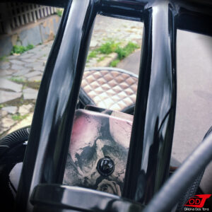 Seguiram-se ainda os serviços de pintura completa da moto com uma combinação de preto fosco, acetinado e brilhante e detalhe de water transfer de caveiras; capotaria do banco com material sintético e costura diamante; instalação de velocímetro redondo pequeno e retrovisores custom; montagem completa; ajustes e testes finais. Mas sem mais delongas, vamos direto agora ao resultado final.