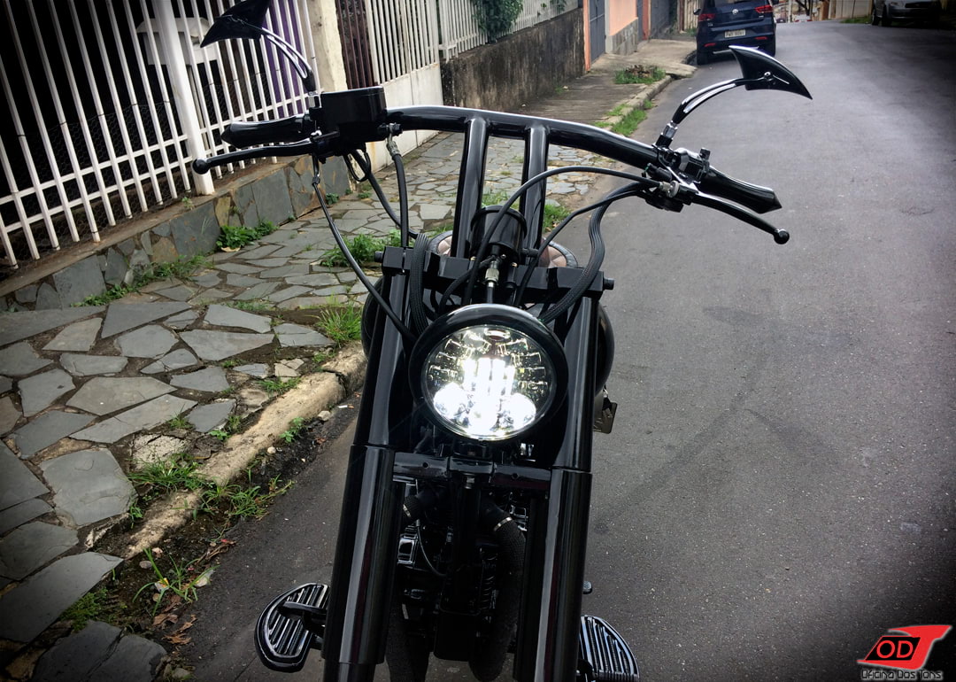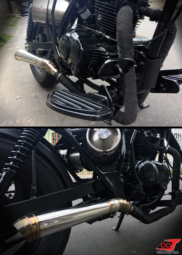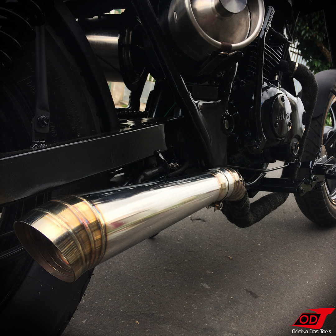 Falta citar ainda duas últimas peças-chave da moto: o guidão T-bar que compôs muito bem o visual da frente juntamente com as bengalas, trouxe estilo, presença e conforto na tocada; e a ponteira estilo megafone com cordões de solda à mostra, que encorpou o som da moto e deu o toque final no aspecto rústico do projeto.