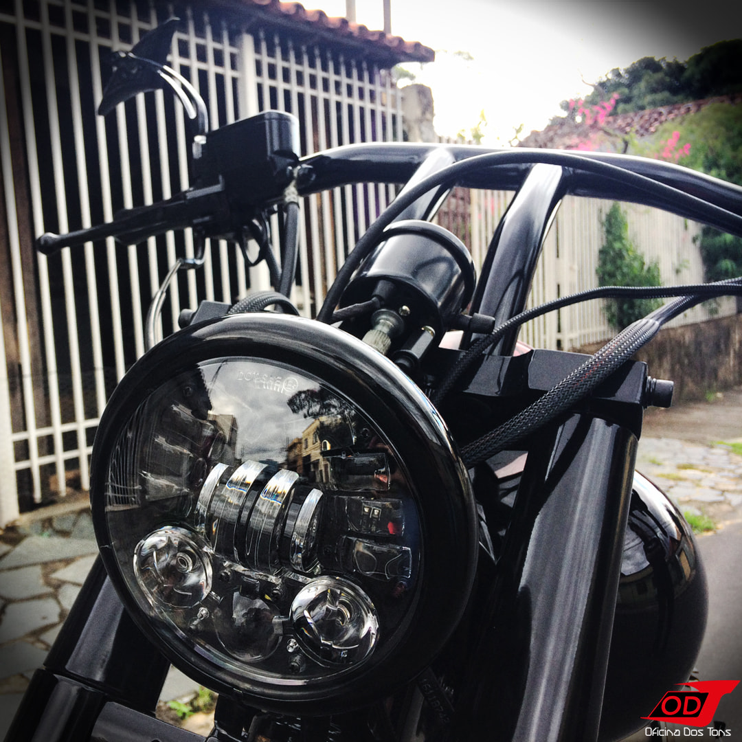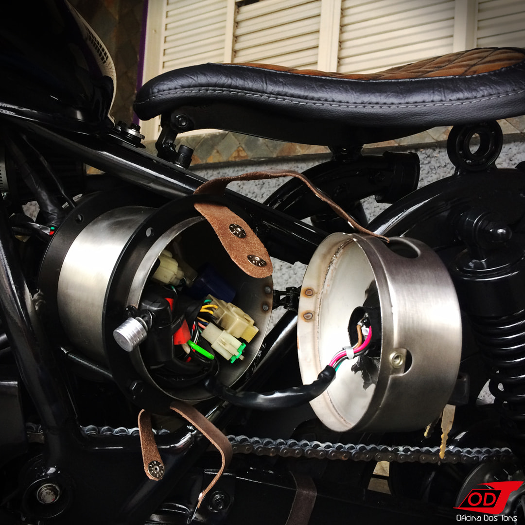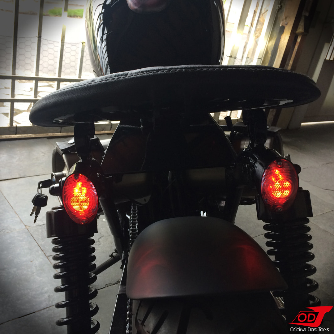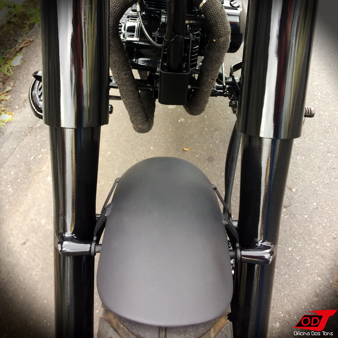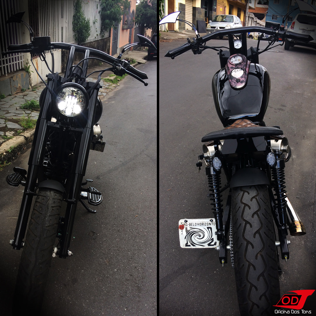 Essa moto já havia sofrido anteriormente algumas modificações feitas pelo cliente, como retirada do banco do garupa, encurtamento do paralama traseiro, detalhes de pintura em preto fosco, instalação de suporte de placa lateral e troca de algumas peças, mas o cliente solicitou à Oficina que criasse e produzisse do zero um visual completo Bobber para a sua moto.