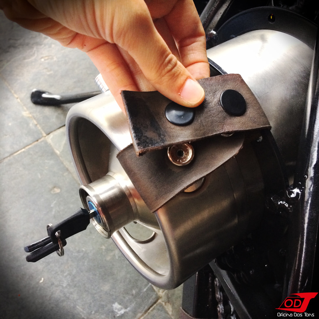 Para garantir a fixação dos barris e facilitar a sua retirada, fizemos correias de couro com botões de pressão. No barril esquerdo, para acomodar o chicote elétrico, fizemos um corte reto na parte superior, com adaptação de dobradiça e parafuso torneado, permitindo abri-lo e fechá-lo. Vale destacar ainda a possibilidade de ‘esconder’ a ignição da moto ao deixar o barril com a sua tampa de rosca.