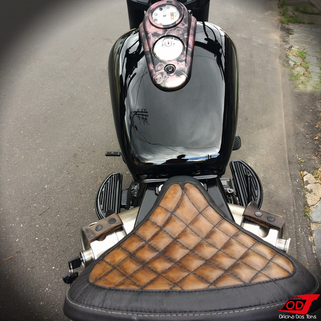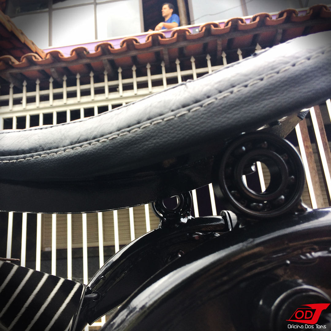 As clássicas molas que normalmente sustentam a parte traseira do banco em projetos Bobber dessa vez foram substituídas por suportes fixos customizados feitos a partir de rolamentos. Essa foi uma escolha primeiramente estética, mas também por proporcionar mais firmeza na pilotagem, principalmente em curvas. Reiterando que não há perda de conforto, uma vez que esse não é um modelo ‘rabo duro’, e o amortecimento fica a cargo da própria suspensão traseira da moto.
