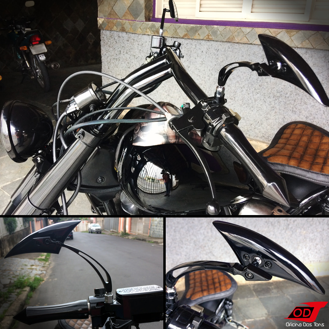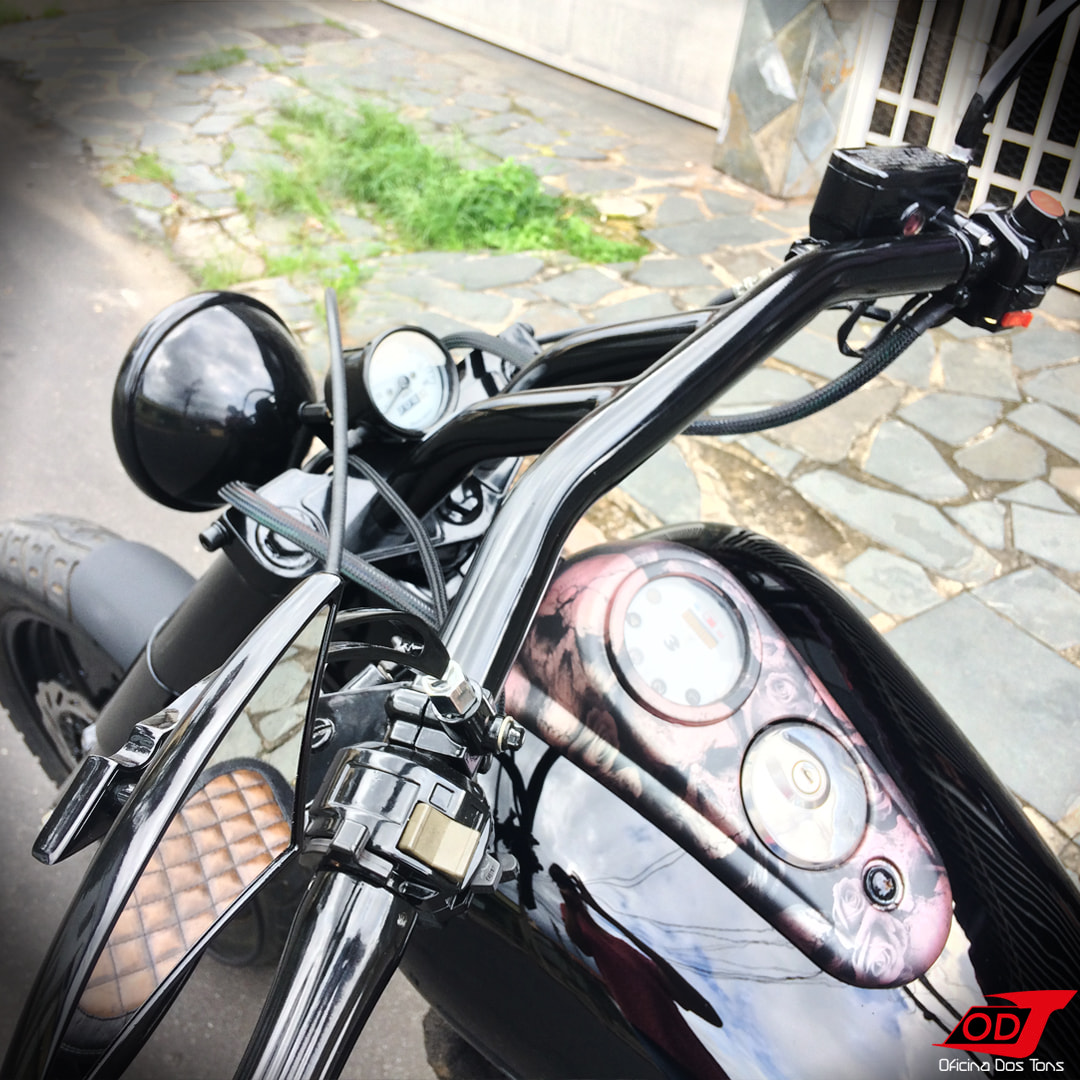 Seguiram-se ainda os serviços de pintura completa da moto com uma combinação de preto fosco, acetinado e brilhante e detalhe de water transfer de caveiras; capotaria do banco com material sintético e costura diamante; instalação de velocímetro redondo pequeno e retrovisores custom; montagem completa; ajustes e testes finais. Mas sem mais delongas, vamos direto agora ao resultado final.