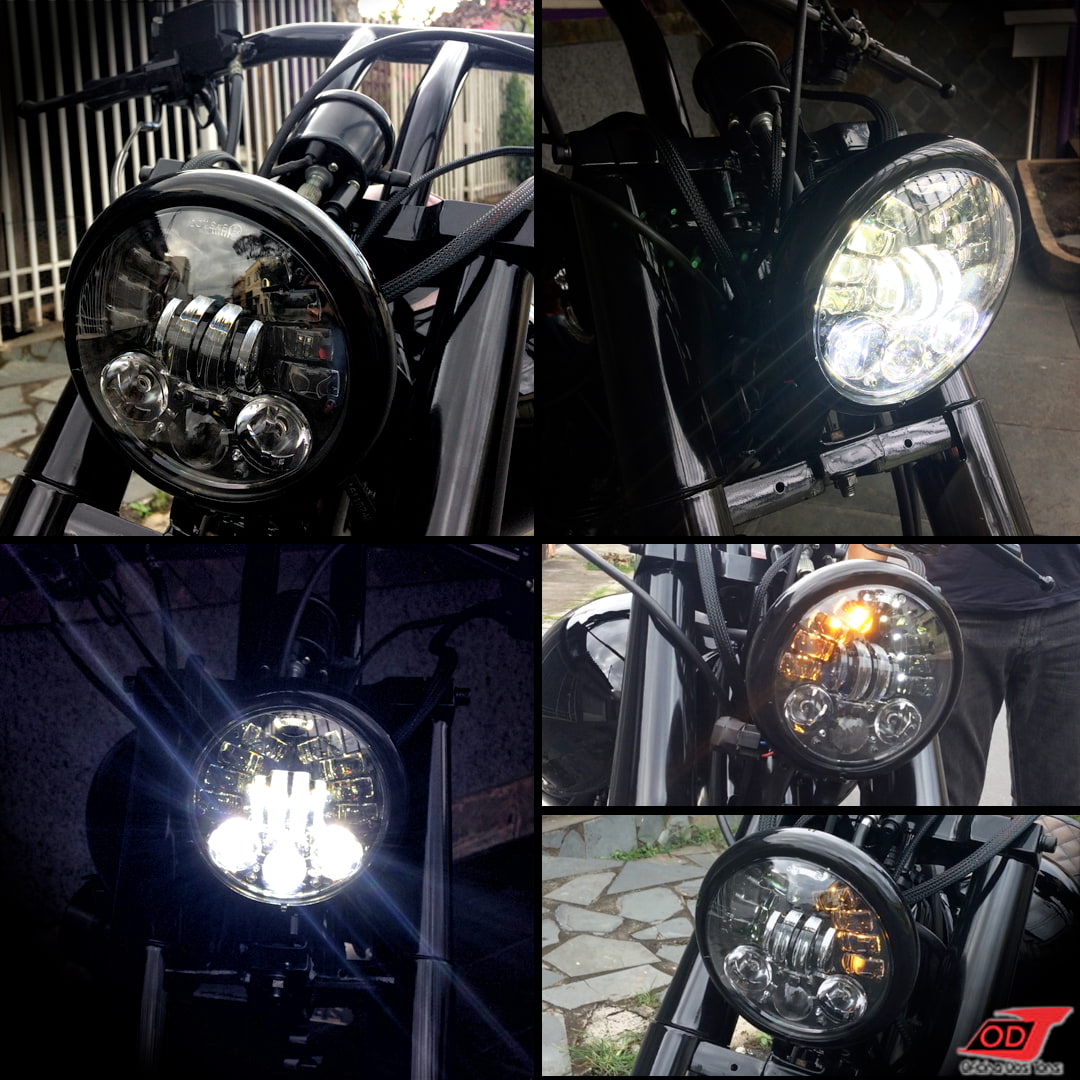 Como já pode ser visto na foto anterior, substituímos o farol da moto por modelo de led de 5.75” com carcaça redonda e produzimos seu suporte com usinagem de espaçadores. Optamos por farol com função de setas embutidas, o que, juntamente com paralama dianteiro curto, proporcionou deixar a frente da moto bem limpa.