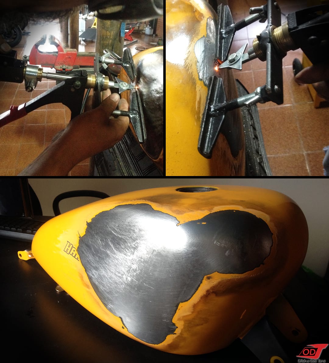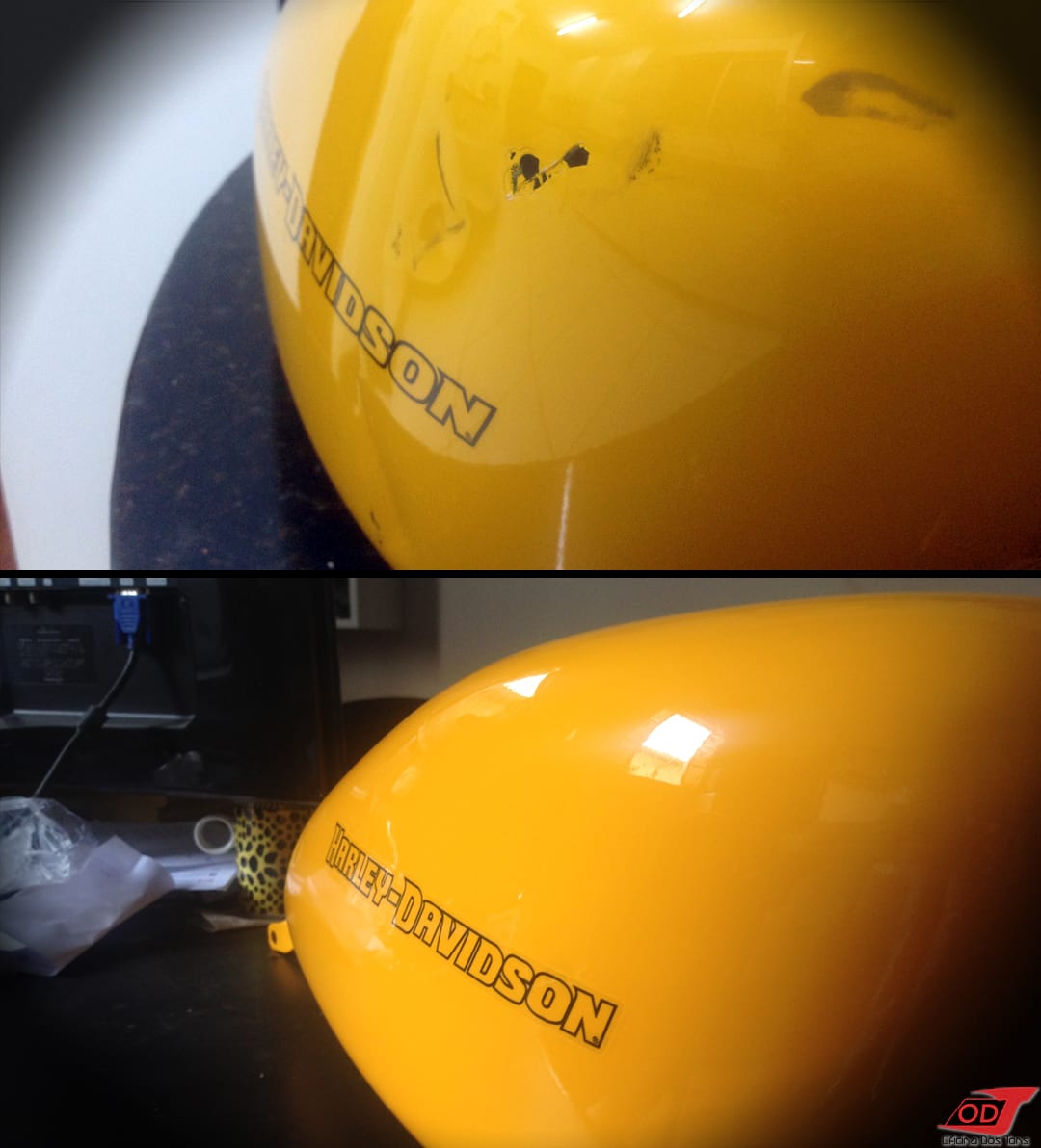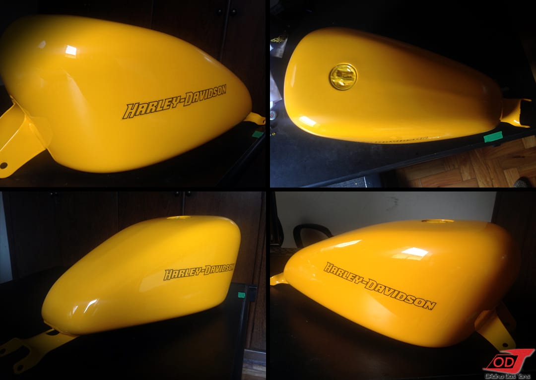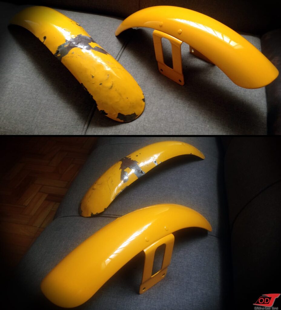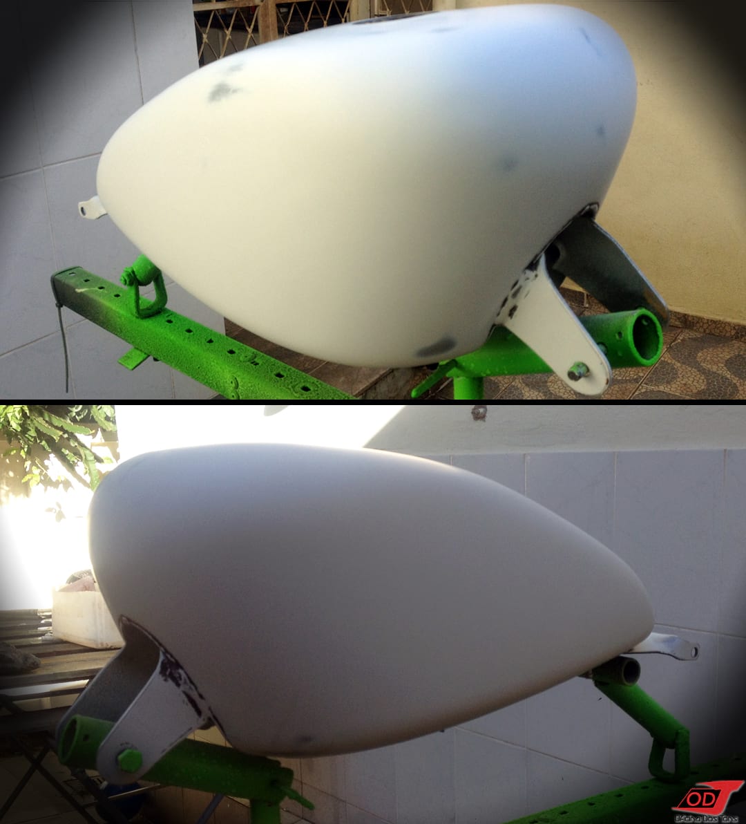 Detalhes: O trabalho envolveu a lanternagem de pequenos amassados e arranhados na lateral direita do tanque, aplicação de proteção interna contra propagação de ferrugem, produção e ajuste da tinta amarelo especial, produção de adesivo com fonte igual à original, pintura e polimento. Além disso, foi produzida uma nova chapa para o paralama dianteiro que chegou totalmente retorcido e feita a repintura.