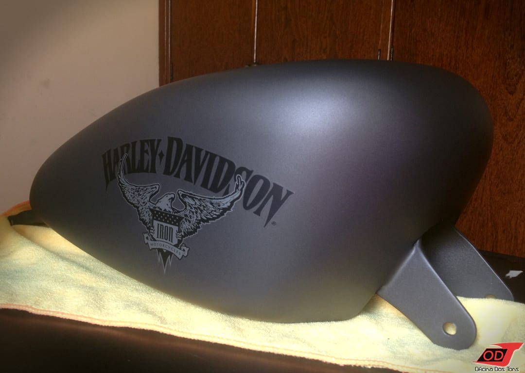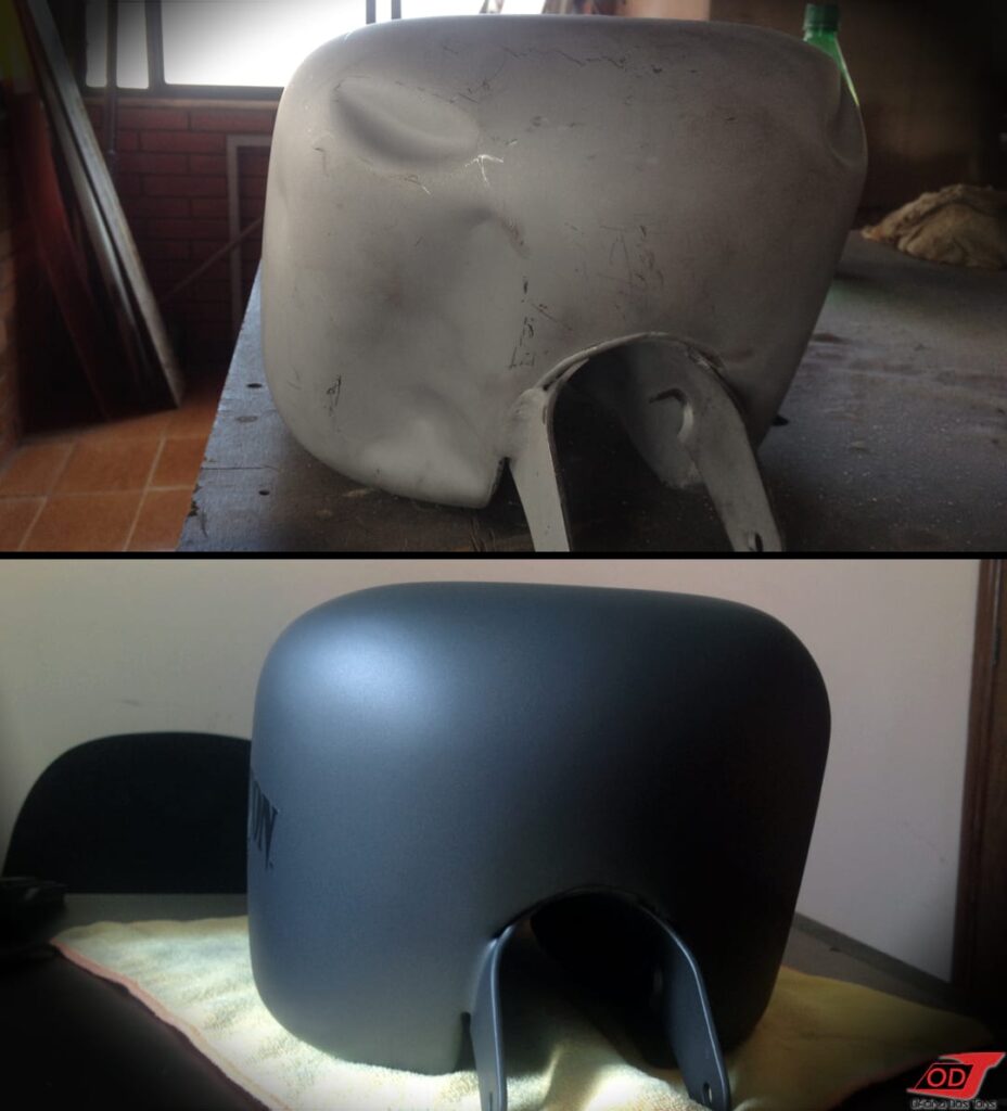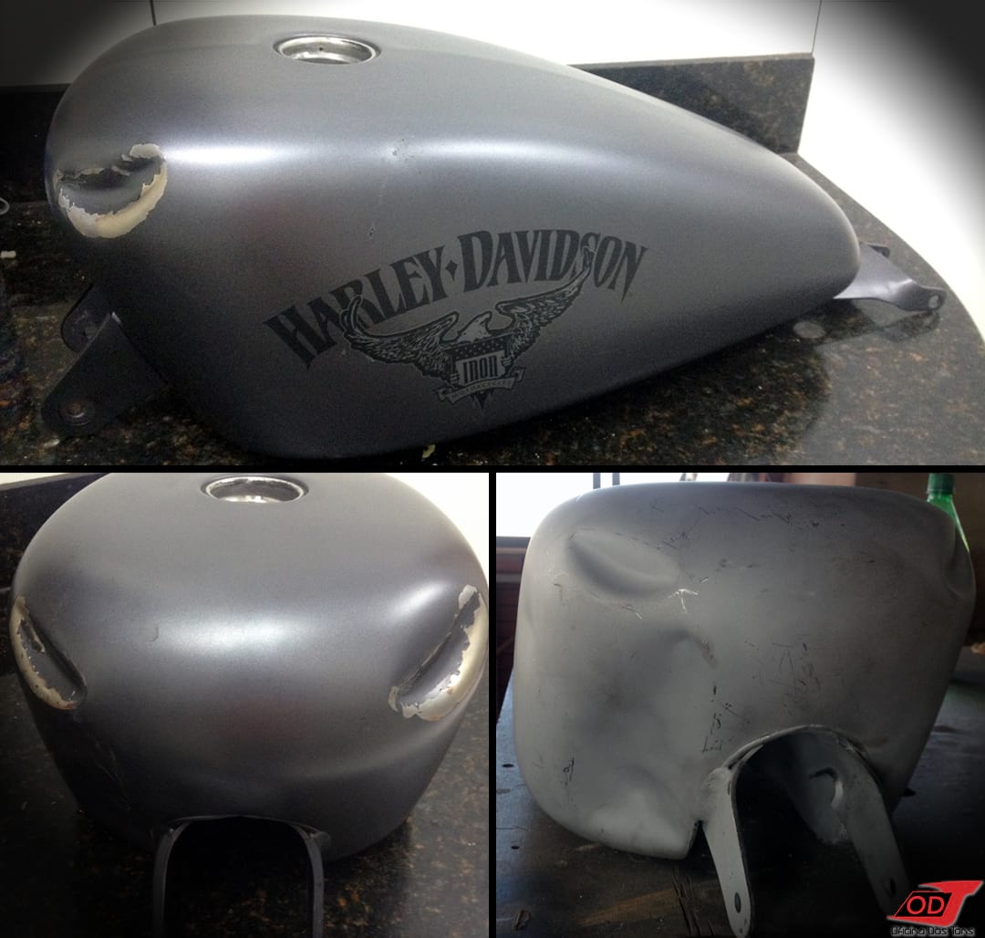 Detalhes: O trabalho envolveu a lanternagem de amassado leve no paralama dianteiro e de amassados profundos nas duas laterais do tanque, em pontos de curvatura bem complexos de trabalhar; aplicação de proteção interna contra propagação de ferrugem; produção e ajuste da tinta cinza fosco especial; produção de adesivo com grafismo igual ao original; pintura e polimento.