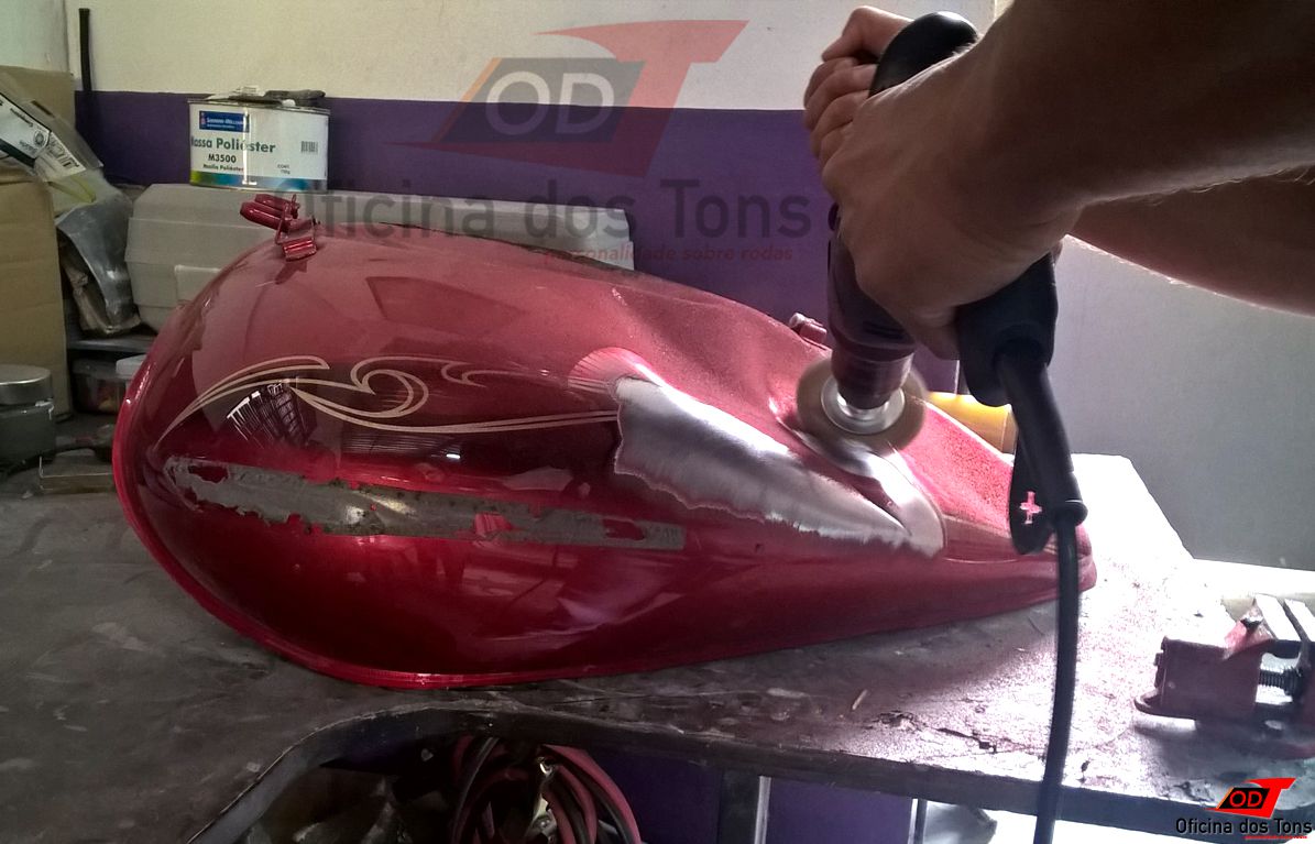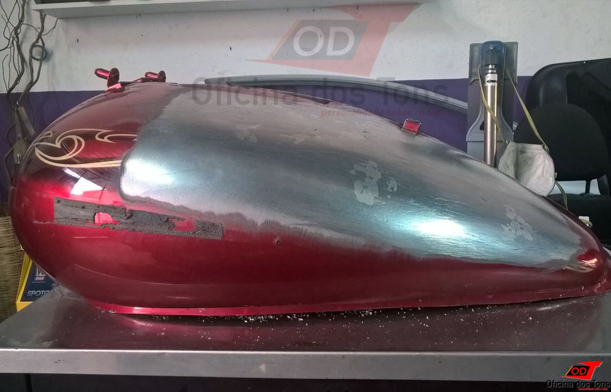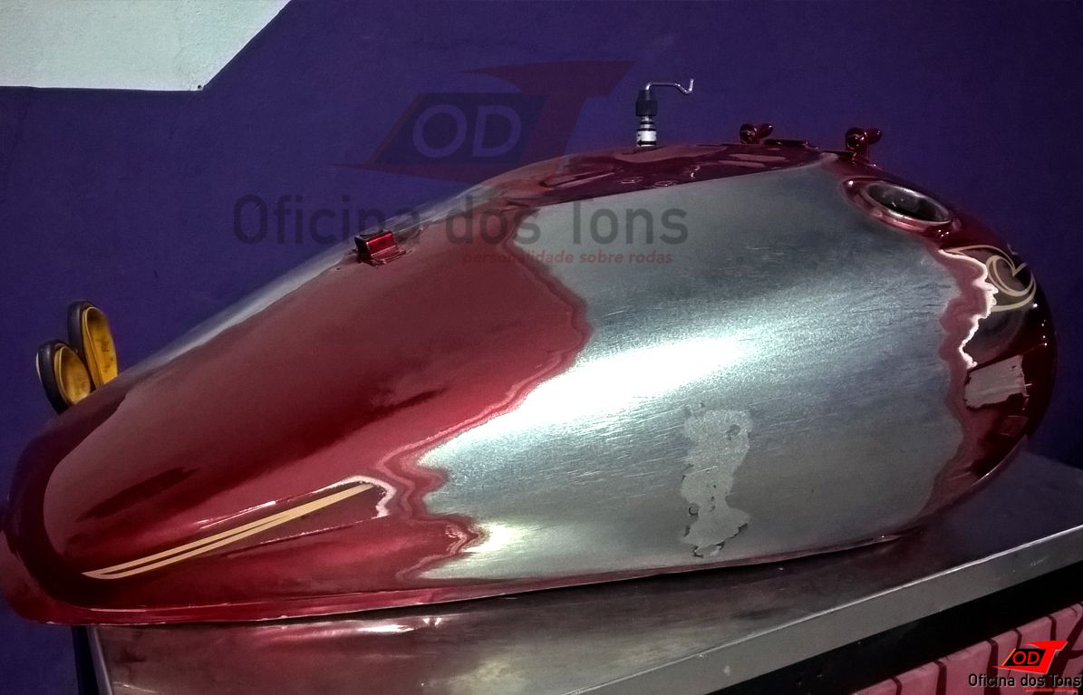 Serviço: Restauração completa de tanque com lanternagem de amassados, pintura tri-coat e aplicação de adesivos.