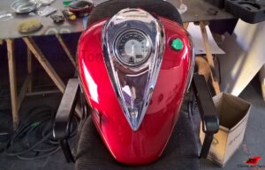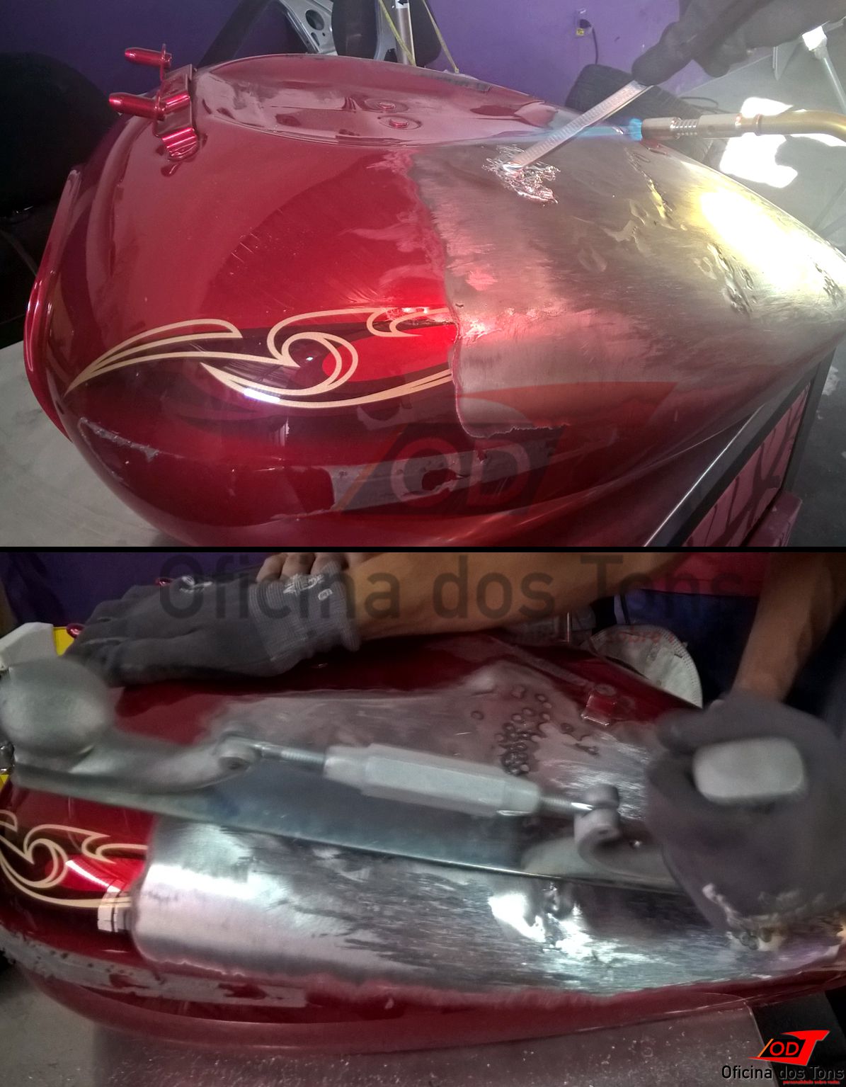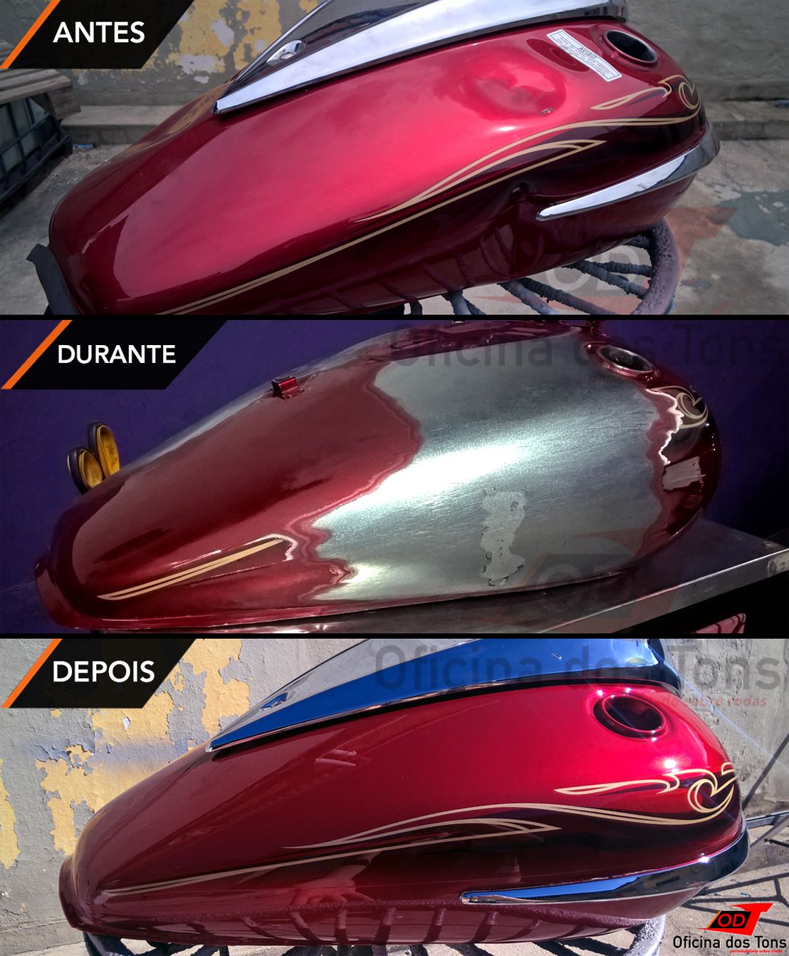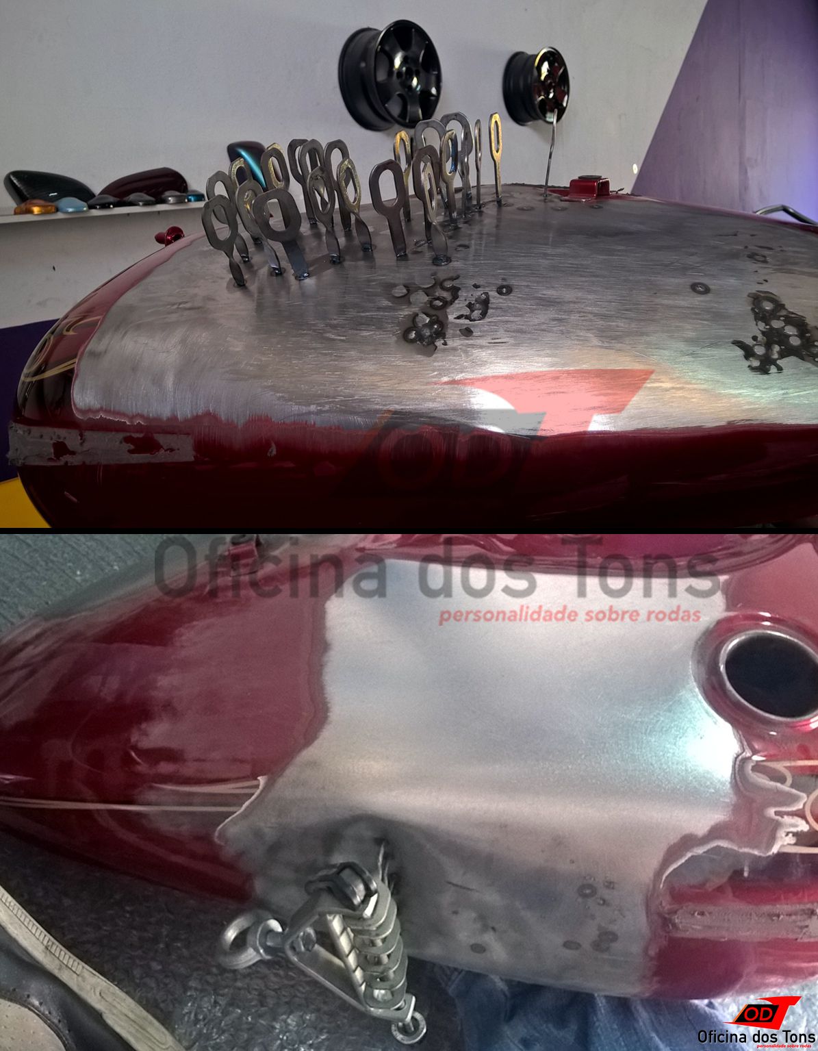 Serviço: Restauração completa de tanque com lanternagem de amassados, pintura tri-coat e aplicação de adesivos.