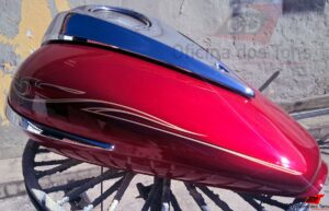 Detalhes: A lanternagem foi feita com técnicas de repuxo da lata, sem uso de massa para preenchimento dos amassados. Foi realizado também um trabalho minucioso de ajuste de tonalidade da tinta a partir da peça e do código de cor da moto, além de testes de aplicação e quantidade de demãos para aproximar ao máximo da pintura original. Por fim, foram aplicados adesivos novos seguindo os padrões de fábrica, e recolocados os acabamentos cromados.