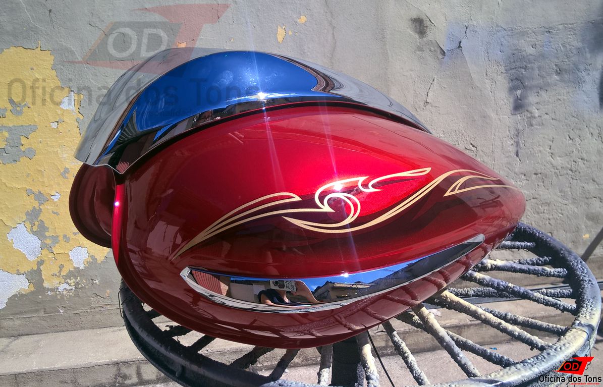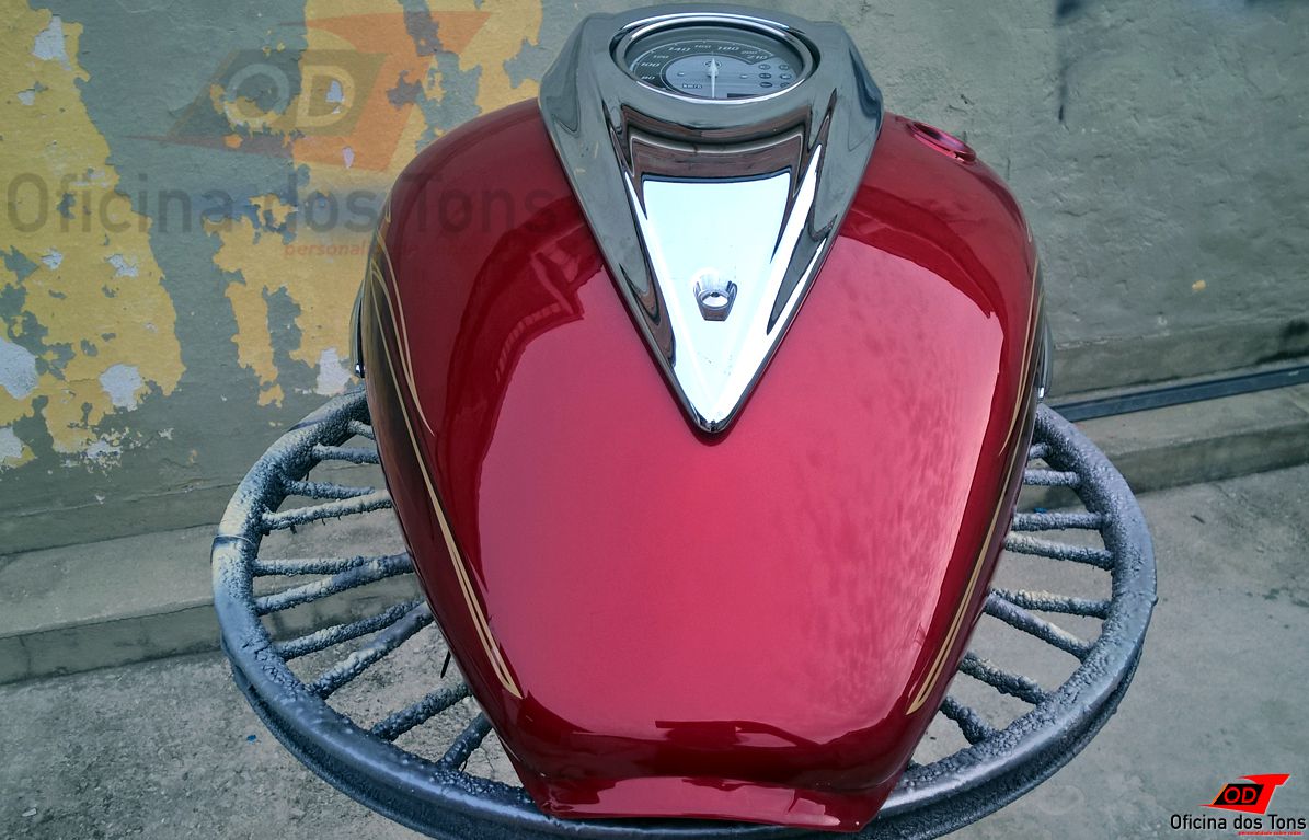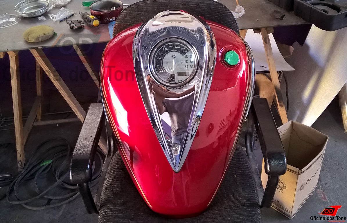 Detalhes: A lanternagem foi feita com técnicas de repuxo da lata, sem uso de massa para preenchimento dos amassados. Foi realizado também um trabalho minucioso de ajuste de tonalidade da tinta a partir da peça e do código de cor da moto, além de testes de aplicação e quantidade de demãos para aproximar ao máximo da pintura original. Por fim, foram aplicados adesivos novos seguindo os padrões de fábrica, e recolocados os acabamentos cromados.