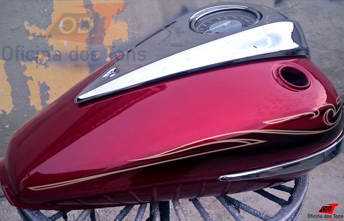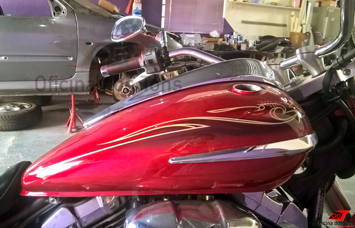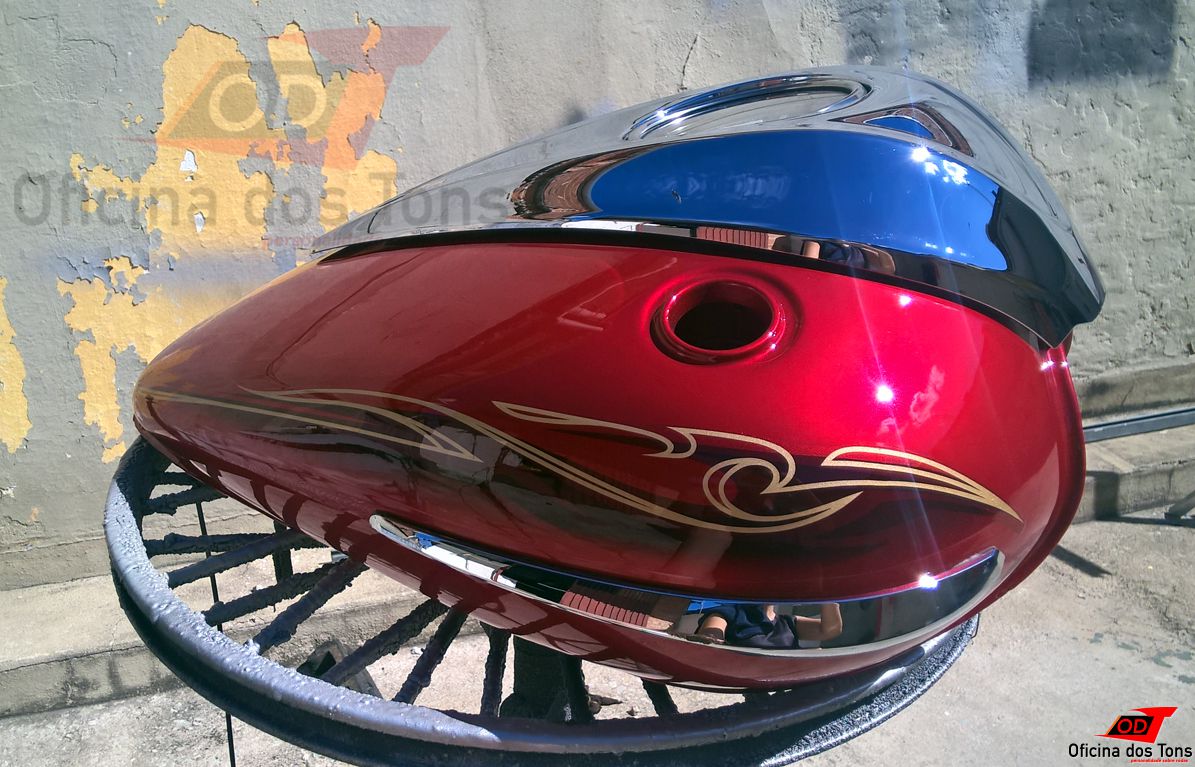Serviço: Restauração completa de tanque com lanternagem de amassados, pintura tri-coat e aplicação de adesivos.