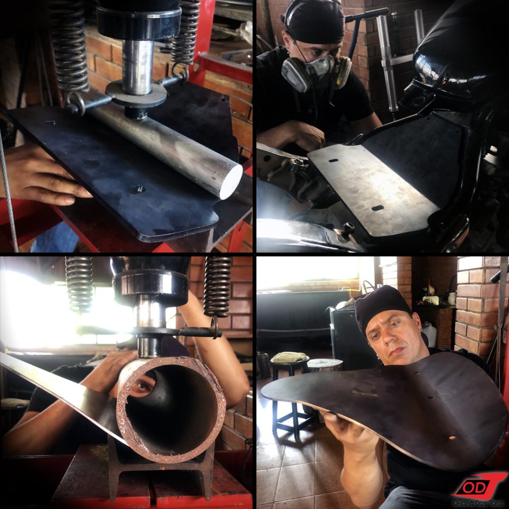 O trabalho manual de manipulação do aço para criar peças únicas sob medida se estendeu ainda para os paralamas, suportes de farol com abraçadeiras nas bengalas, espadas laterais reduzidas e suporte de placa lateral.