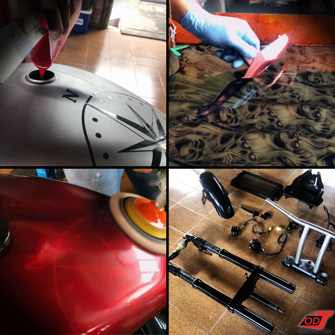 Em seguida, fizemos o tratamento interno do tanque com resina epóxi resistente a combustível para garantir proteção contra ferrugem e evitar possíveis vazamentos. O tanque ganhou ainda um grafismo de rosa dos ventos solicitado pelo cliente e pintura vermelho candy. As laterais receberam detalhes de water transfer textura de caveiras e as demais peças pintura eletrostática preto semibrilho.