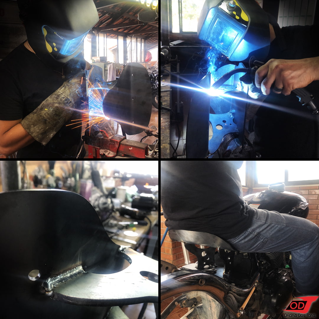 Detalhes: Nosso cliente nos solicitou uma moto que seguisse em linhas gerais a espinha dorsal do que foi feito nos projetos anteriores, com a redução da parte traseira do chassi e das espadas laterais, produção de paralamas curtos rentes aos pneus e banco selim. Mas dessa vez desenvolvemos um suporte fixo central para ajustar a posição de pilotagem ao desejo do cliente, elevando um pouco o banco, aproximando-o mais do tanque, e com maior inclinação para frente.
