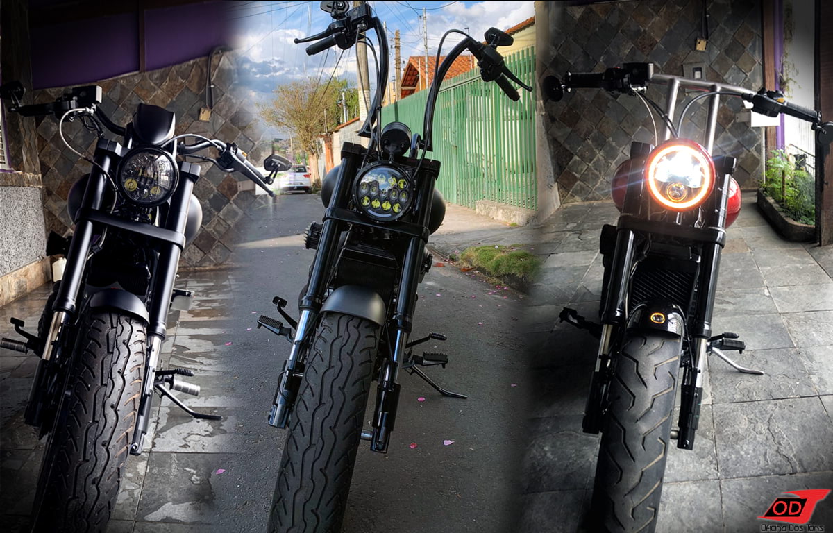 Definimos juntos com o cliente ainda mais alguns diferenciais para deixar sua moto com um visual único e representar seus gostos e personalidade. Assim, optamos por fazer a relocação do velocímetro para dentro do tanque; o filtro de ar ganhou tampa com grafismo personalizado; utilizamos uma tonalidade mais marcante na pintura; o modelo do guidão escolhido dessa vez foi o T-bar e do farol foi o de led com angel eyes; adaptamos fitas de led nas bengalas como setas dianteiras, dentre outras modificações.