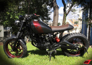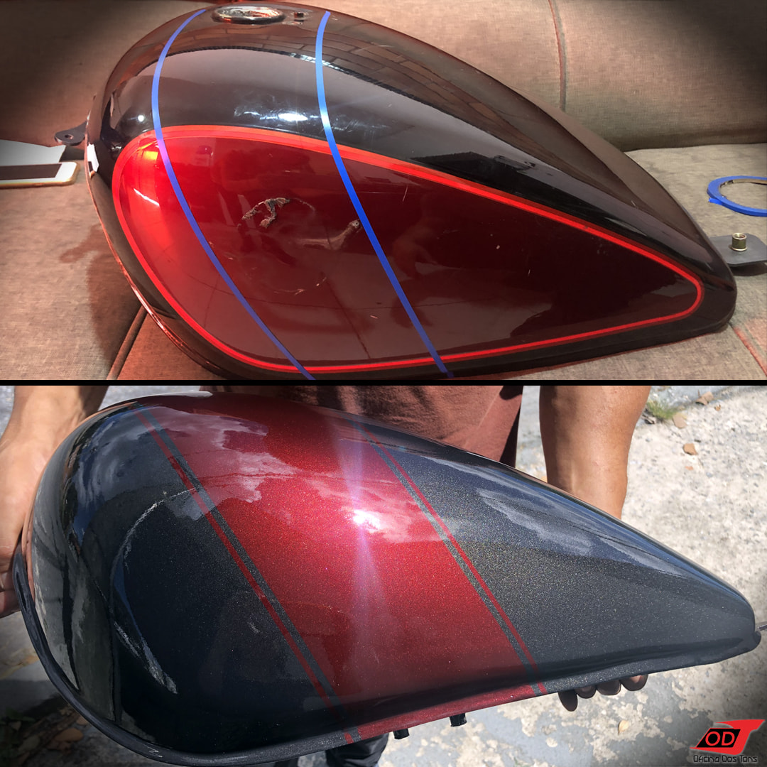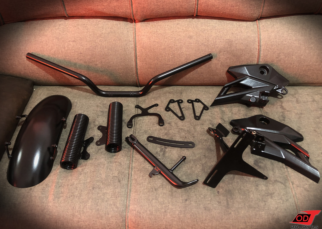 A moto é então totalmente desmontada e repintada com uma base de preto semibrilho e detalhes exclusivos de acordo com as preferências do cliente e sugestões nossas.