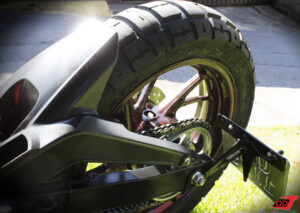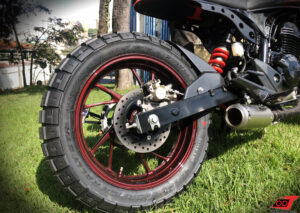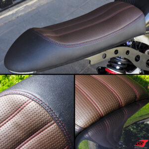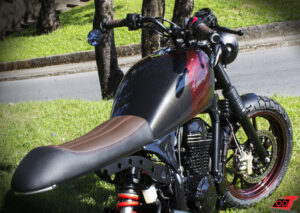 Para conversar de forma harmônica com os contornos abaulados do tanque escolhido para essa moto, os suportes da parte traseira do chassi foram desenhados com curvas e círculos. O novo banco foi projetado para 1 pessoa e seu formato incluiu a “rabetinha Cafe Racer” clássica, e seu movimento forma exatamente um arco imaginário com o ponto mais alto do tanque.