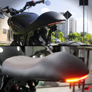 Por fim, como acessórios personalizados da moto foram escolhidos farol de led com angel eyes partido em 4 sessões, setas dianteiras personalizadas instaladas nas pontas do guidão juntamente com os retrovisores, velocímetro digital redondo, cabos de freio aeroquip e fita de led para freio e setas embutida na parte final do chassi.