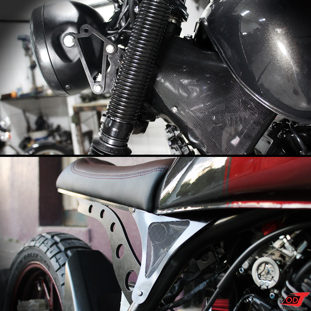 Para dar acabamento à junção tanque e banco, criamos uma tampa lateral com desenho personalizado e detalhe de telinha. Com esse mesmo material, criamos acabamentos laterais para a parte frontal do tanque, fazendo alusão àquelas peças que existem de fábrica em alguns modelos de motos custom, como por exemplo a Shadow 600. Assim, o visual global da moto foi totalmente reprojetado, onde cada peça se encaixa perfeitamente na outra e não sobram vãos ou arestas, nem tampouco ficam expostas partes indesejadas do chassi ou fiação.