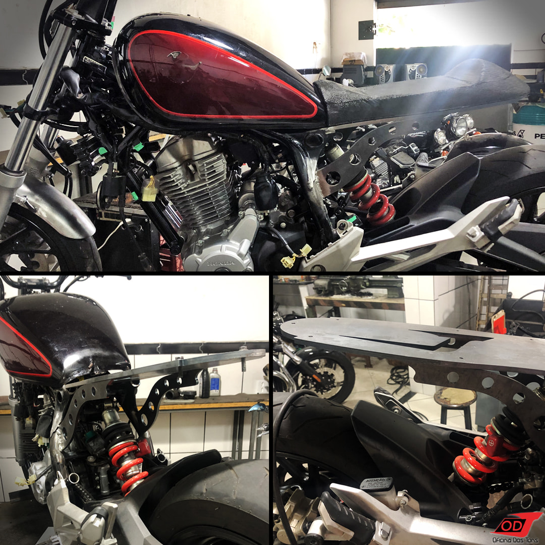 Aqui na Oficina dos Tons nós fazemos um estudo minucioso de cada modificação e conversamos abertamente com o cliente sobre o que deve ou não ser feito na moto e também sobre os limites entre a estética e o conforto e a dirigibilidade. Tudo isso para que o cliente saia daqui totalmente satisfeito, com uma moto em perfeito funcionamento e com toda a condição para que revisões e manutenções mecânicas futuras possam ser feitas por nós ou em outras oficinas.