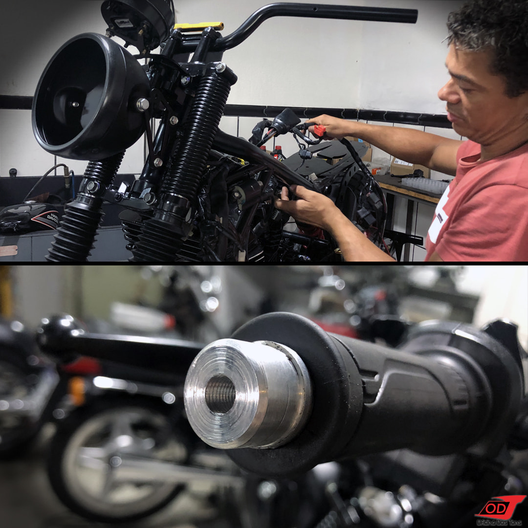 Destacamos aqui alguns serviços que passam despercebido quando se olha a moto pronta, mas são fundamentais para garantir um belo acabamento final, um bom funcionamento e uma fácil manutenção futura. Um deles é a realocação do chicote elétrico e seus componentes para pontos escondidos da moto e a adaptação para receber os acessórios novos. E podemos citar ainda pequenas soluções como tarugos com rosca usinados sob medida e prensados nas pontas do guidão para receber com exatidão os retrovisores e setas e não atrapalhar o funcionamento da manopla de aceleração.