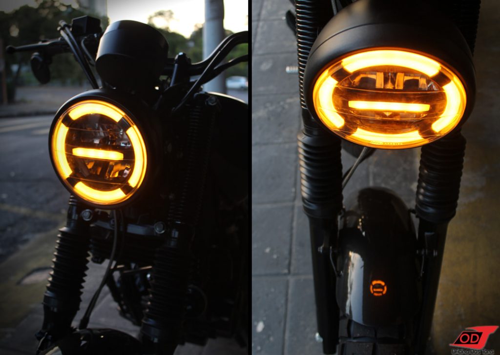 Por fim, como acessórios personalizados da moto foram escolhidos farol de led com angel eyes partido em 4 sessões, setas dianteiras personalizadas instaladas nas pontas do guidão juntamente com os retrovisores, velocímetro digital redondo, cabos de freio aeroquip e fita de led para freio e setas embutida na parte final do chassi.