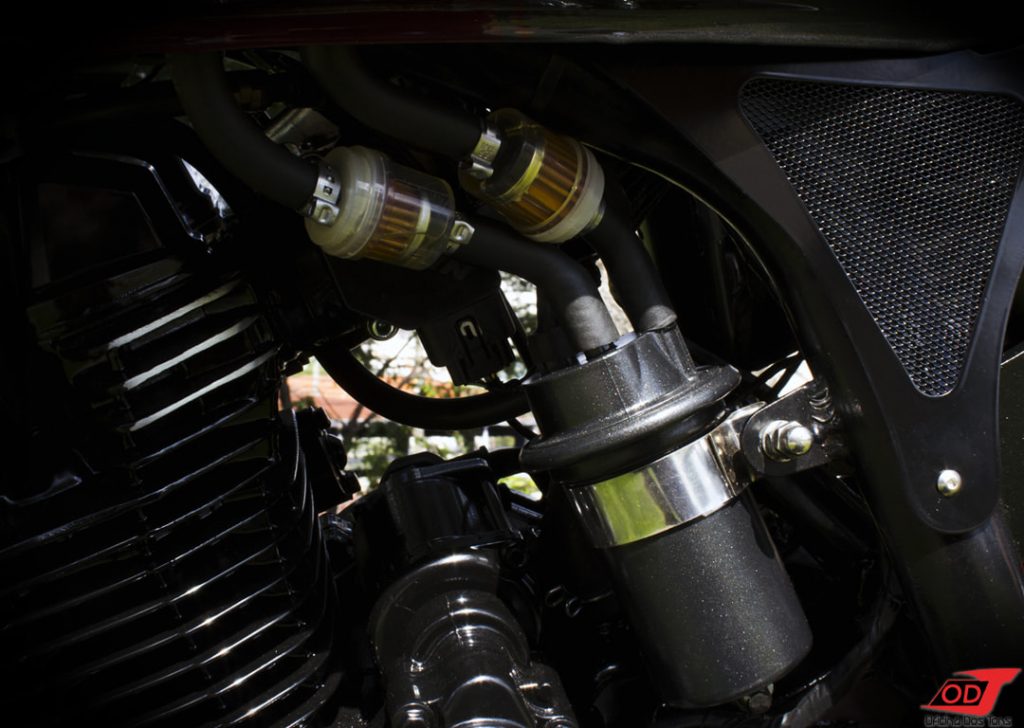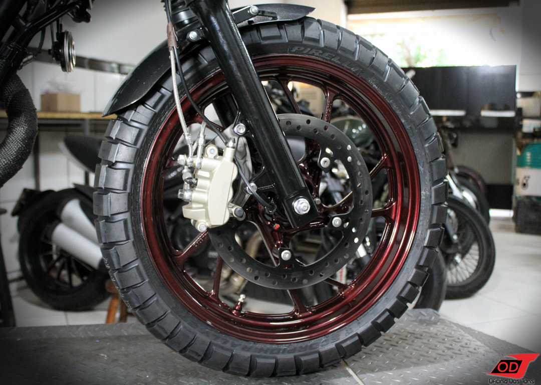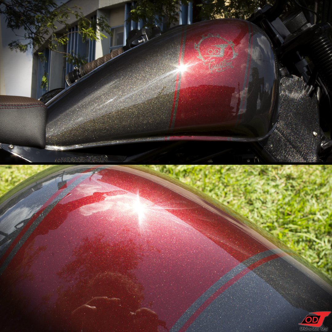 A moto é então totalmente desmontada e repintada com uma base de preto semibrilho e detalhes exclusivos de acordo com as preferências do cliente e sugestões nossas.