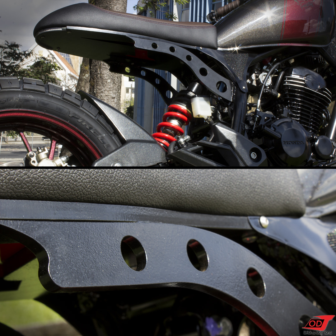 Para conversar de forma harmônica com os contornos abaulados do tanque escolhido para essa moto, os suportes da parte traseira do chassi foram desenhados com curvas e círculos. O novo banco foi projetado para 1 pessoa e seu formato incluiu a “rabetinha Cafe Racer” clássica, e seu movimento forma exatamente um arco imaginário com o ponto mais alto do tanque.