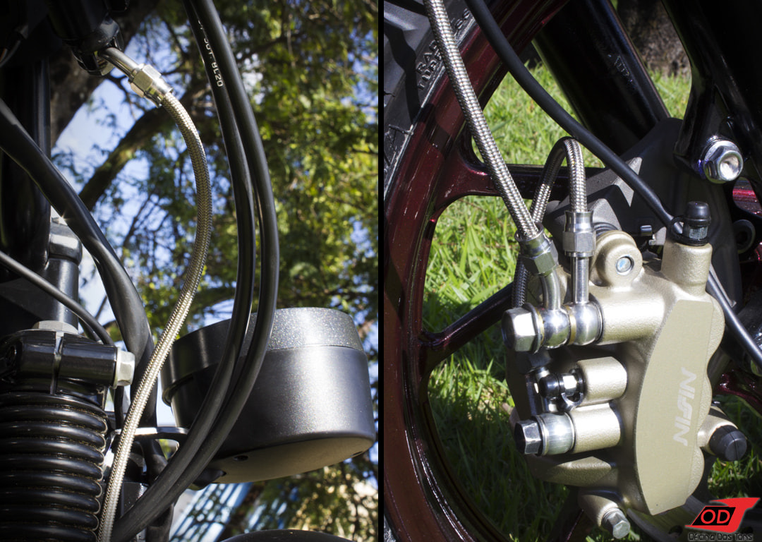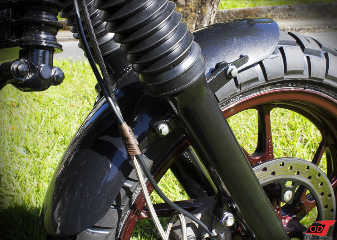 Para alcançar um visual frontal mais robusto, alongado e totalmente customizado, foram produzidas molas de acabamento pretas para parte superior das bengalas que levam também os suportes para o farol, instaladas sanfonas pretas e pintadas de preto as canelas.
